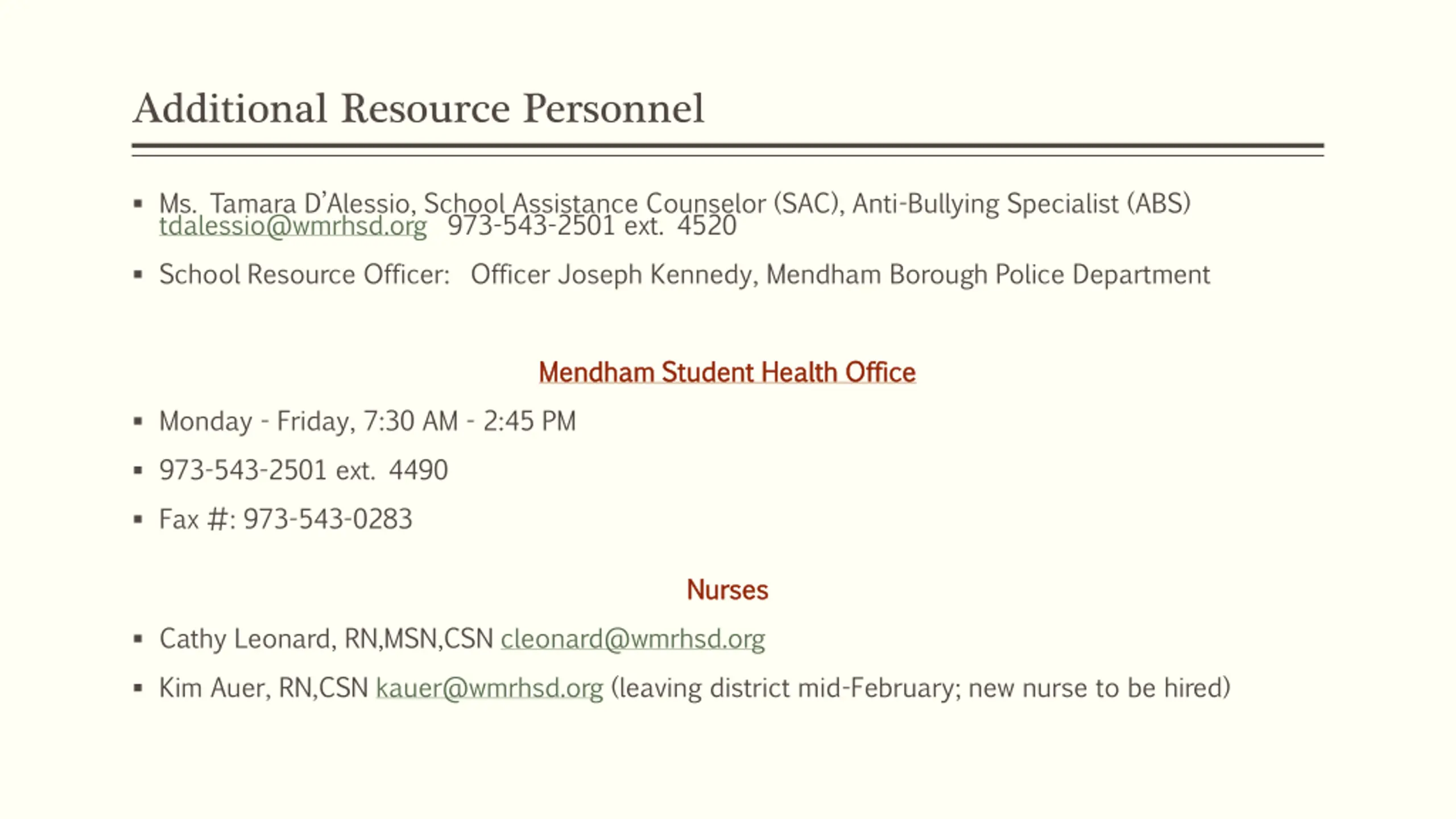 Additional Resource Personnel Ms. Tamara D Alessio, School Assistance Counselor (SAC), Anti-Bullying Specialist (ABS) tdalessio@wmrhsd.org 973-543-2501 ext. 4520 School Resource Officer: Officer Joseph Kennedy, Mendham Borough Police Department Mendham Student Health Office Mendham Student Health Office Monday - Friday, 7:30 AM - 2:45 PM 973-543-2501 ext. 4490 Fax #: 973-543-0283 Nurses Nurses Cathy Leonard, RN,MSN,CSN cleonard@wmrhsd.org Kim Auer, RN,CSN kauer@wmrhsd.org (leaving district mid-February; new nurse to be hired)