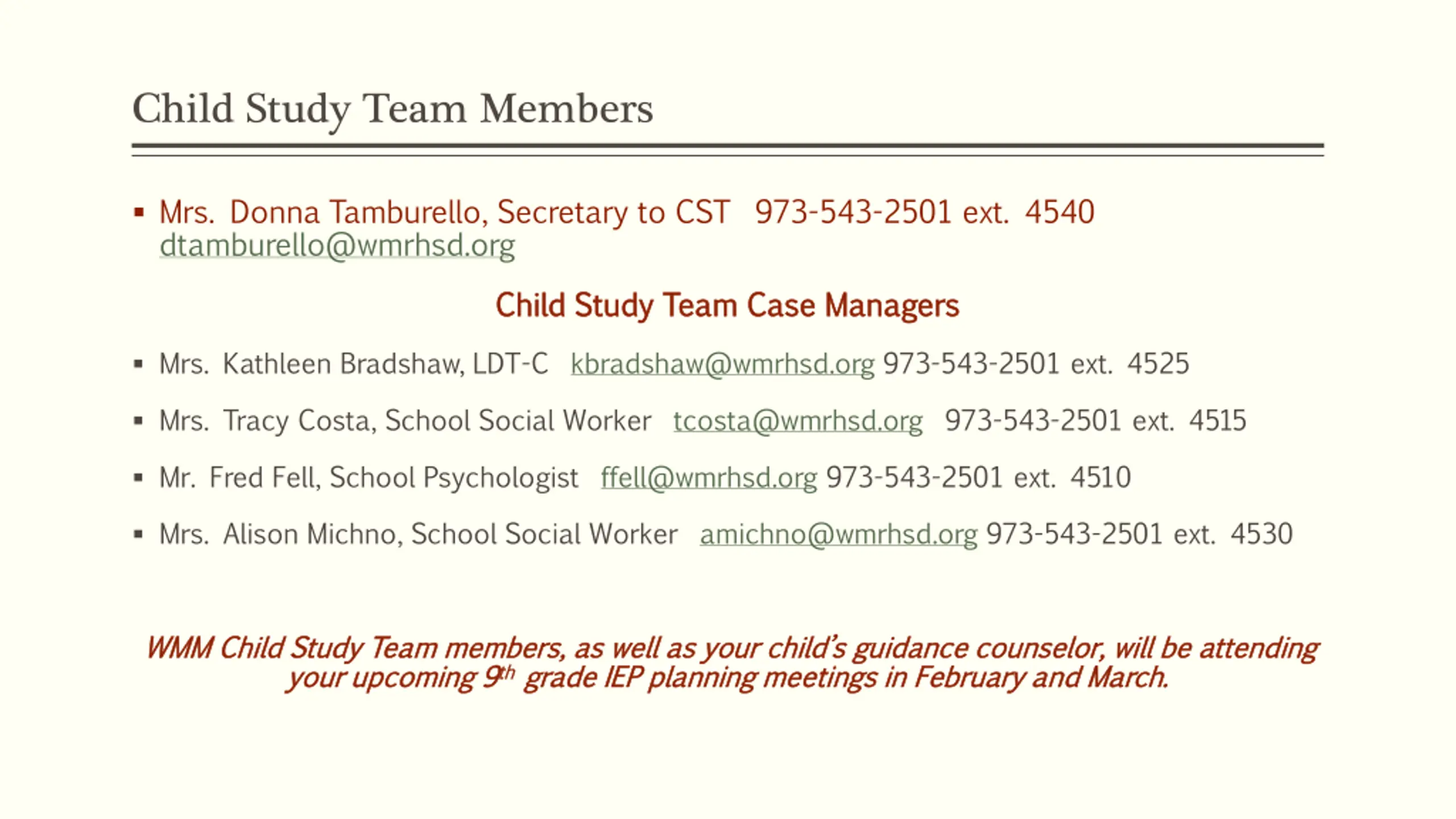Child Study Team Members Mrs. Donna Tamburello, Secretary to CST 973-543-2501 ext. 4540 dtamburello@wmrhsd.org Child Study Team Case Managers Child Study Team Case Managers Mrs. Kathleen Bradshaw, LDT-C kbradshaw@wmrhsd.org 973-543-2501 ext. 4525 Mrs. Tracy Costa, School Social Worker tcosta@wmrhsd.org 973-543-2501 ext. 4515 Mr. Fred Fell, School Psychologist ffell@wmrhsd.org 973-543-2501 ext. 4510 Mrs. Alison Michno, School Social Worker amichno@wmrhsd.org 973-543-2501 ext. 4530 WMM Child Study Team members, as well as your child s guidance counselor, will be attending WMM Child Study Team members, as well as your child s guidance counselor, will be attending your upcoming 9 your upcoming 9th grade IEP planning meetings in February and March. thgrade IEP planning meetings in February and March.