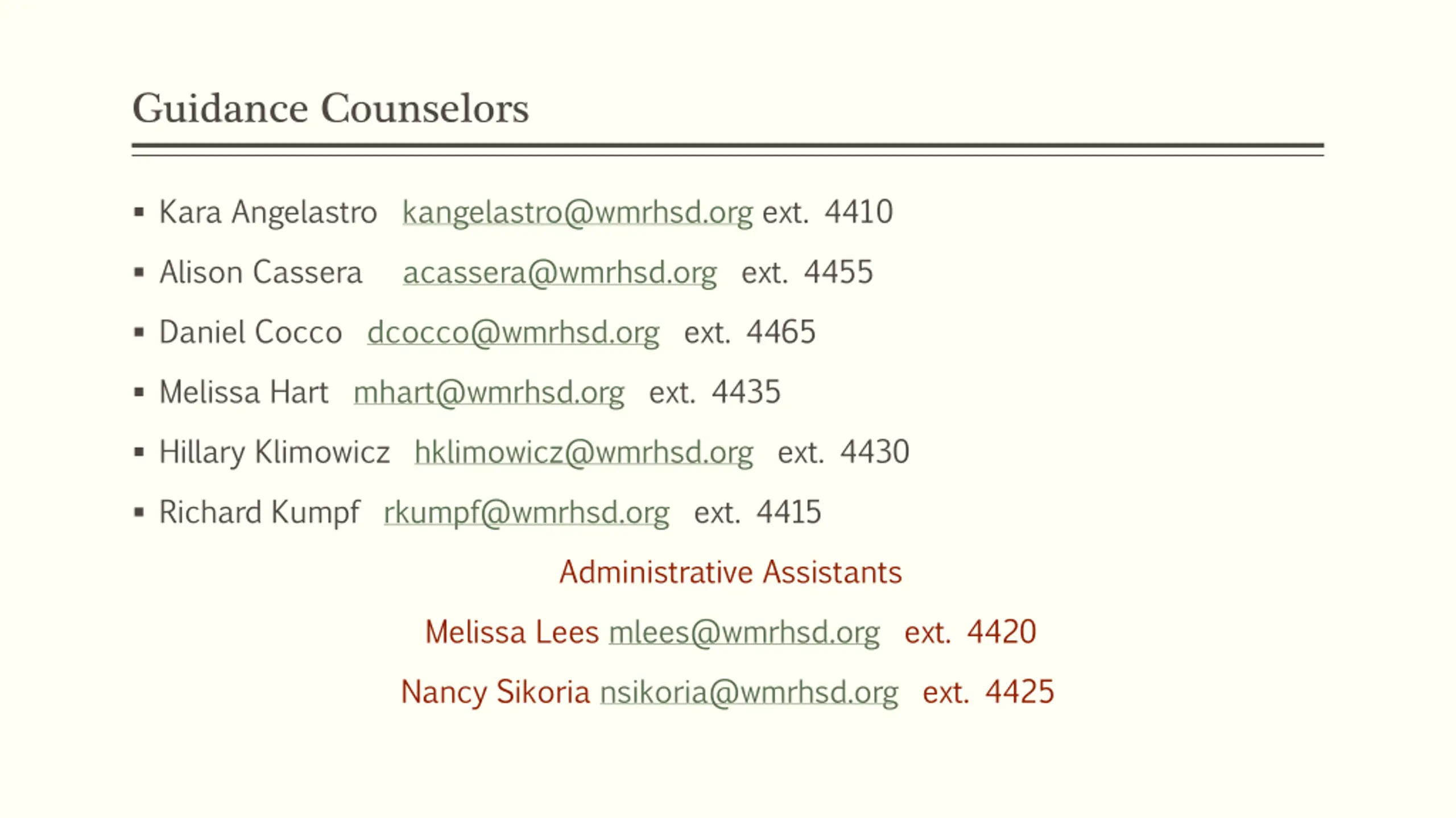 Guidance Counselors Kara Angelastro kangelastro@wmrhsd.org ext. 4410 Alison Cassera acassera@wmrhsd.org ext. 4455 Daniel Cocco dcocco@wmrhsd.org ext. 4465 Melissa Hart mhart@wmrhsd.org ext. 4435 Hillary Klimowicz hklimowicz@wmrhsd.org ext. 4430 Richard Kumpf rkumpf@wmrhsd.org ext. 4415 Administrative Assistants Melissa Lees mlees@wmrhsd.org ext. 4420 Nancy Sikoria nsikoria@wmrhsd.org ext. 4425