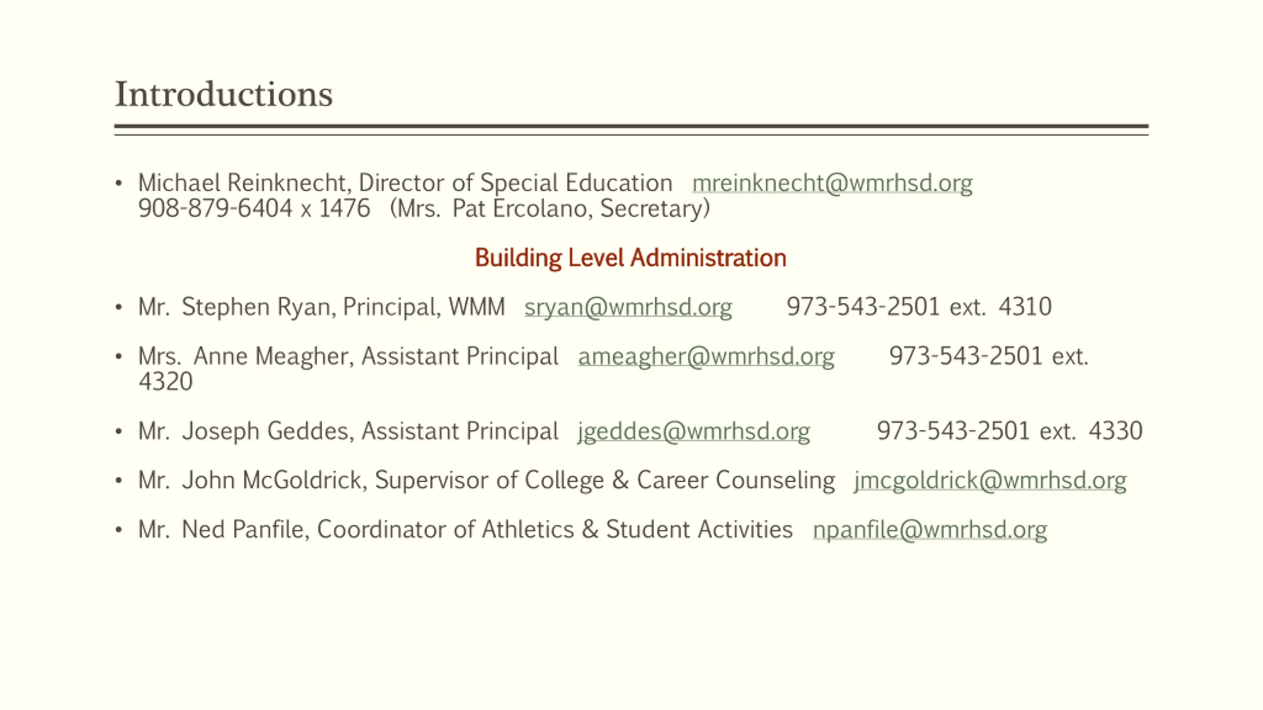 Introductions Michael Reinknecht, Director of Special Education mreinknecht@wmrhsd.org 908-879-6404 x 1476 (Mrs. Pat Ercolano, Secretary) Building Level Administration Building Level Administration Mr. Stephen Ryan, Principal, WMM sryan@wmrhsd.org 973-543-2501 ext. 4310 Mrs. Anne Meagher, Assistant Principal ameagher@wmrhsd.org 4320 973-543-2501 ext. Mr. Joseph Geddes, Assistant Principal jgeddes@wmrhsd.org 973-543-2501 ext. 4330 Mr. John McGoldrick, Supervisor of College & Career Counseling jmcgoldrick@wmrhsd.org Mr. Ned Panfile, Coordinator of Athletics & Student Activities npanfile@wmrhsd.org