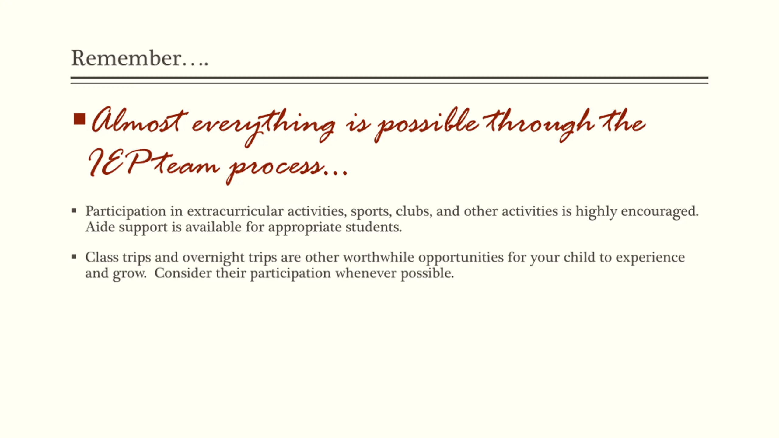Remember. Almost everything is possible through the IEP team process Participation in extracurricular activities, sports, clubs, and other activities is highly encouraged. Aide support is available for appropriate students. Class trips and overnight trips are other worthwhile opportunities for your child to experience and grow. Consider their participation whenever possible.