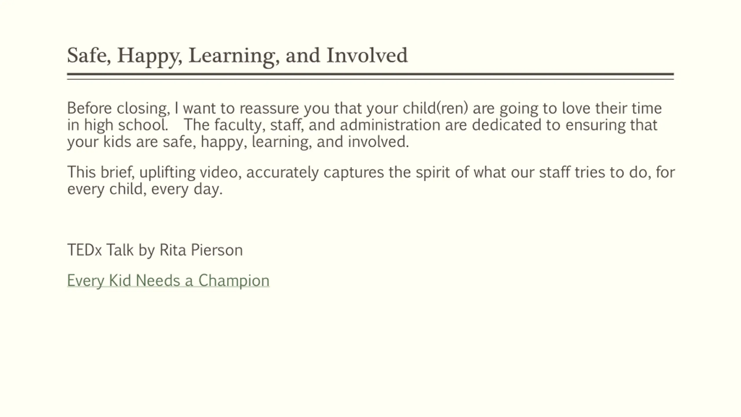 Safe, Happy, Learning, and Involved Before closing, I want to reassure you that your child(ren) are going to love their time in high school. The faculty, staff, and administration are dedicated to ensuring that your kids are safe, happy, learning, and involved. This brief, uplifting video, accurately captures the spirit of what our staff tries to do, for every child, every day. TEDx Talk by Rita Pierson Every Kid Needs a Champion