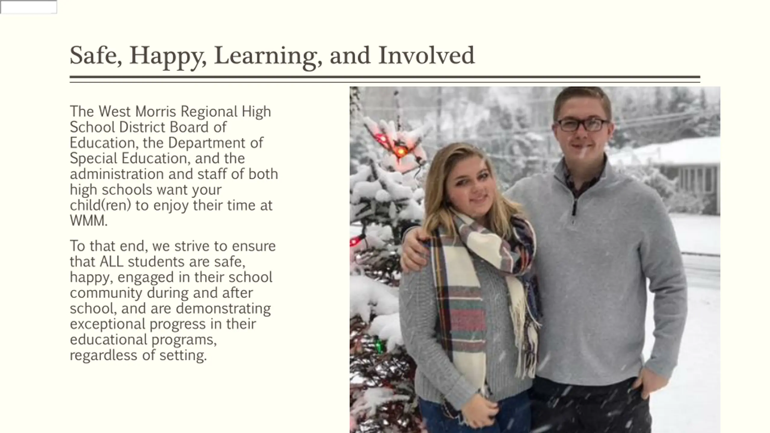 Schools Schools Automatic Safe, Happy, Learning, and Involved The West Morris Regional High School District Board of Education, the Department of Special Education, and the administration and staff of both high schools want your child(ren) to enjoy their time at WMM. To that end, we strive to ensure that ALL students are safe, happy, engaged in their school community during and after school, and are demonstrating exceptional progress in their educational programs, regardless of setting.