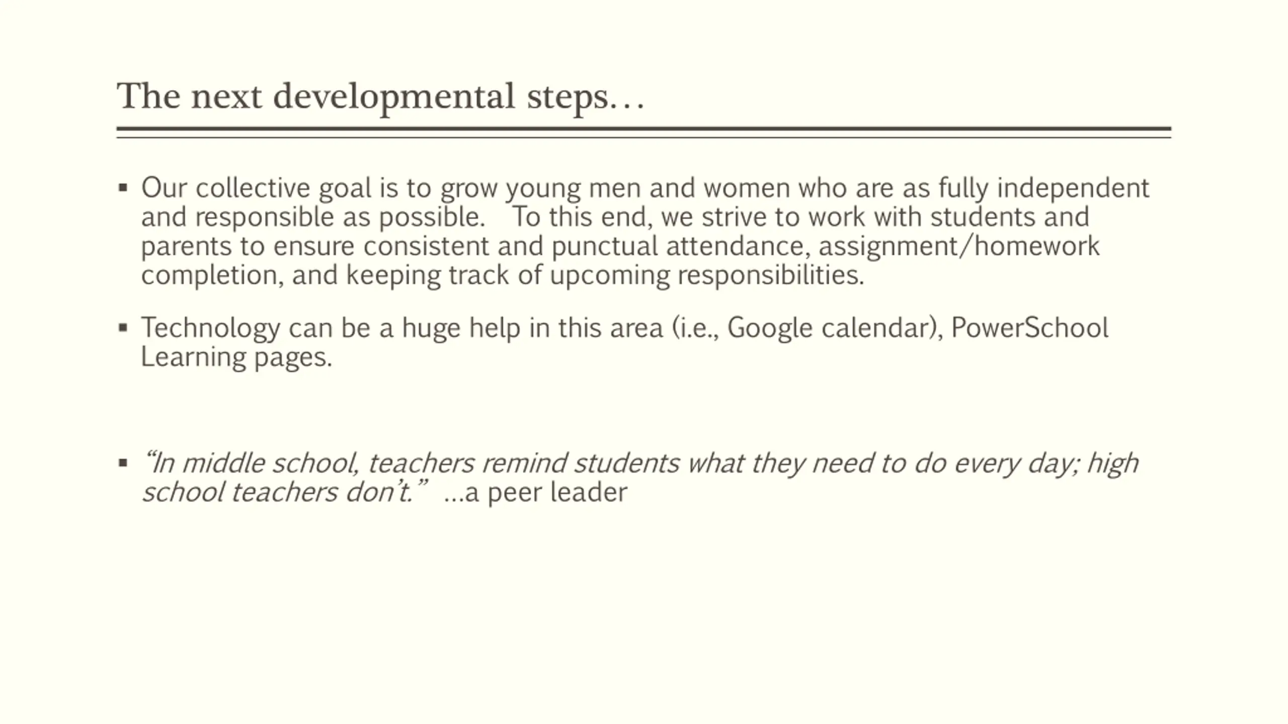 The next developmental steps Our collective goal is to grow young men and women who are as fully independent and responsible as possible. To this end, we strive to work with students and parents to ensure consistent and punctual attendance, assignment/homework completion, and keeping track of upcoming responsibilities. Technology can be a huge help in this area (i.e., Google calendar), PowerSchool Learning pages. In middle school, teachers remind students what they need to do every day; high school teachers don t. a peer leader