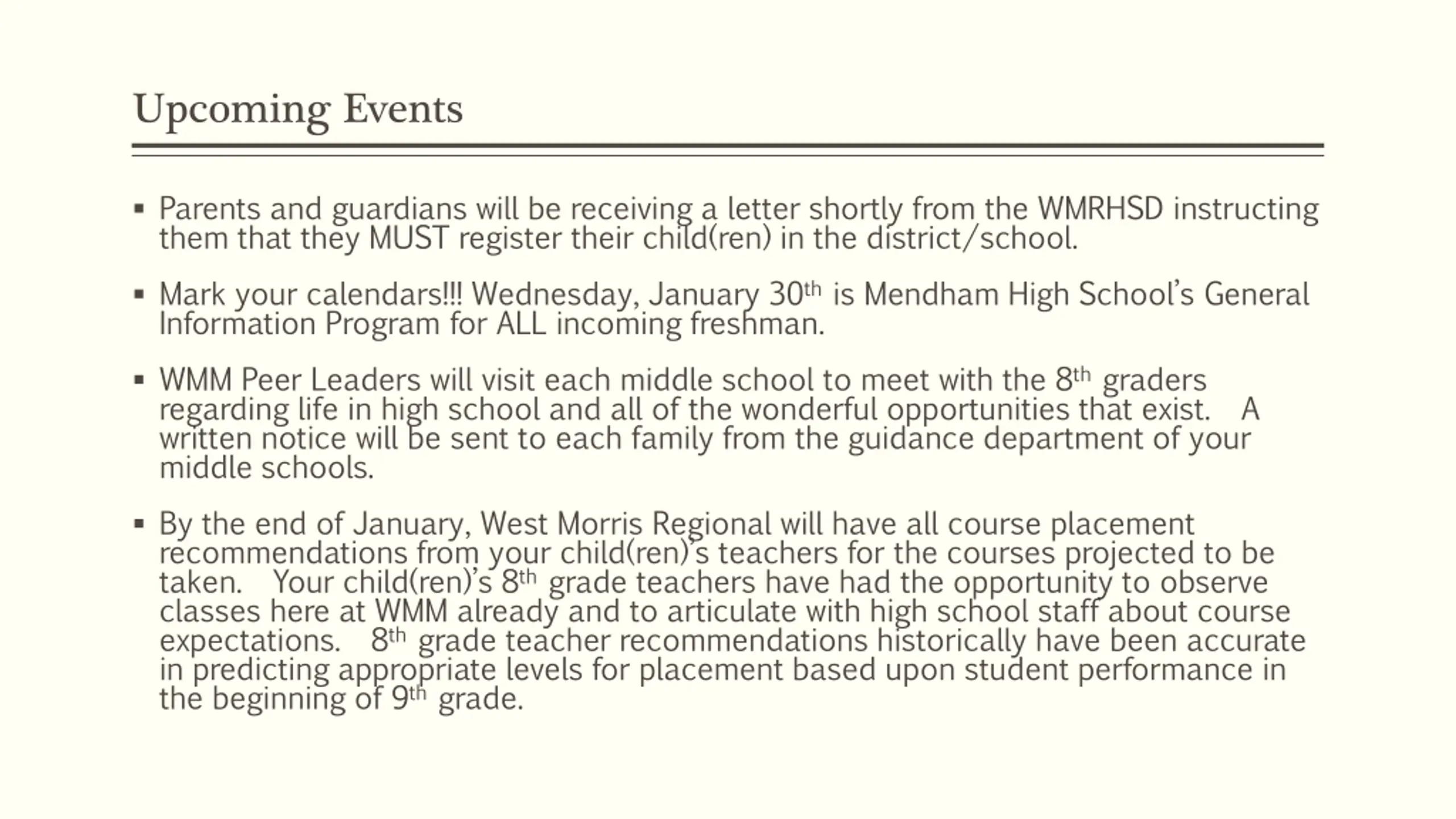 Upcoming Events Parents and guardians will be receiving a letter shortly from the WMRHSD instructing them that they MUST register their child(ren) in the district/school. Mark your calendars!!! Wednesday, January 30this Mendham High School s General Information Program for ALL incoming freshman. WMM Peer Leaders will visit each middle school to meet with the 8th graders regarding life in high school and all of the wonderful opportunities that exist. A written notice will be sent to each family from the guidance department of your middle schools. By the end of January, West Morris Regional will have all course placement recommendations from your child(ren) s teachers for the courses projected to be taken. Your child(ren) s 8th grade teachers have had the opportunity to observe classes here at WMM already and to articulate with high school staff about course expectations. 8th grade teacher recommendations historically have been accurate in predicting appropriate levels for placement based upon student performance in the beginning of 9th grade.
