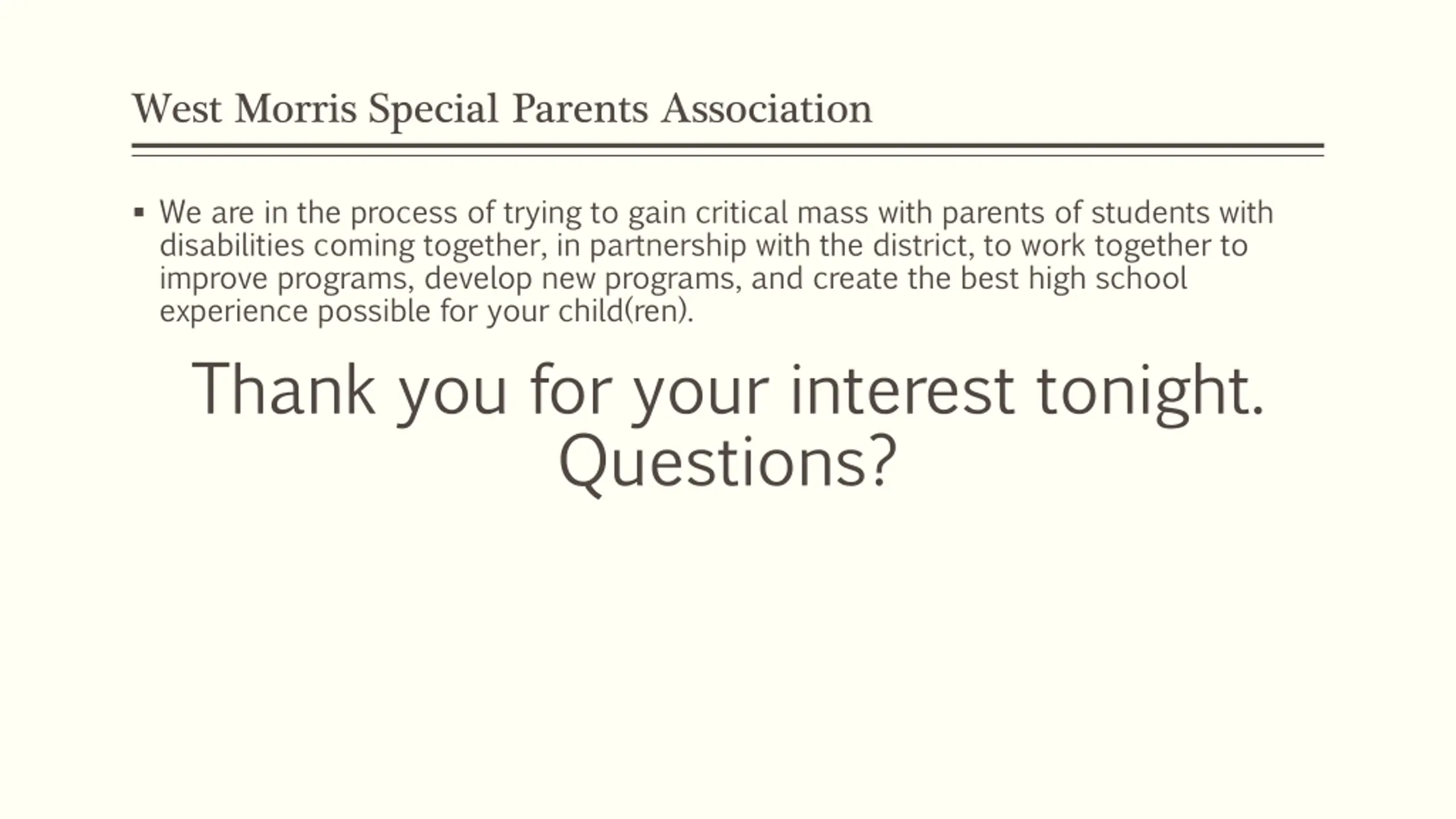 West Morris Special Parents Association We are in the process of trying to gain critical mass with parents of students with disabilities coming together, in partnership with the district, to work together to improve programs, develop new programs, and create the best high school experience possible for your child(ren). Thank you for your interest tonight. Questions?