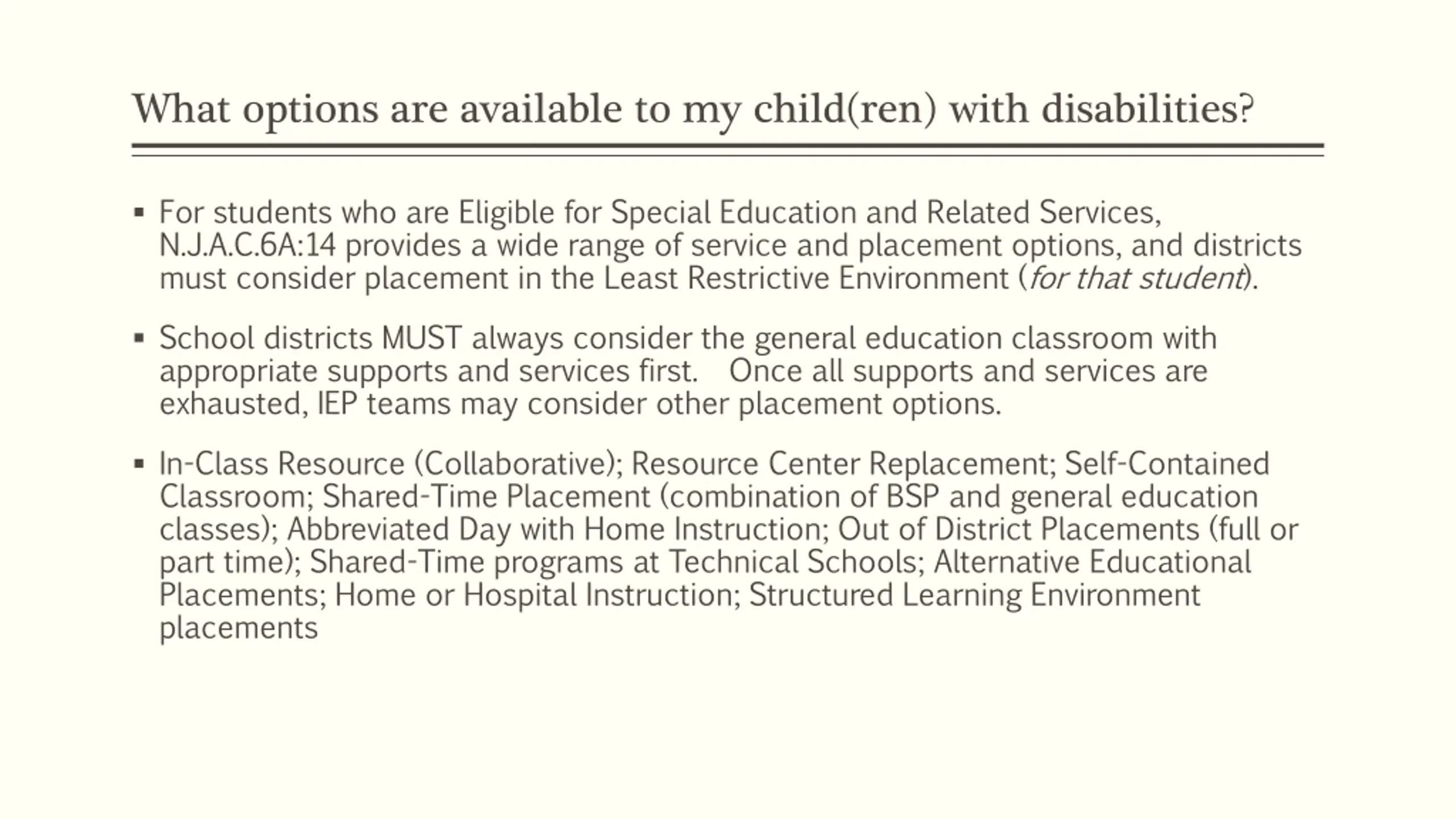 What options are available to my child(ren) with disabilities? For students who are Eligible for Special Education and Related Services, N.J.A.C.6A:14 provides a wide range of service and placement options, and districts must consider placement in the Least Restrictive Environment (for that student). School districts MUST always consider the general education classroom with appropriate supports and services first. Once all supports and services are exhausted, IEP teams may consider other placement options. In-Class Resource (Collaborative); Resource Center Replacement; Self-Contained Classroom; Shared-Time Placement (combination of BSP and general education classes); Abbreviated Day with Home Instruction; Out of District Placements (full or part time); Shared-Time programs at Technical Schools; Alternative Educational Placements; Home or Hospital Instruction; Structured Learning Environment placements