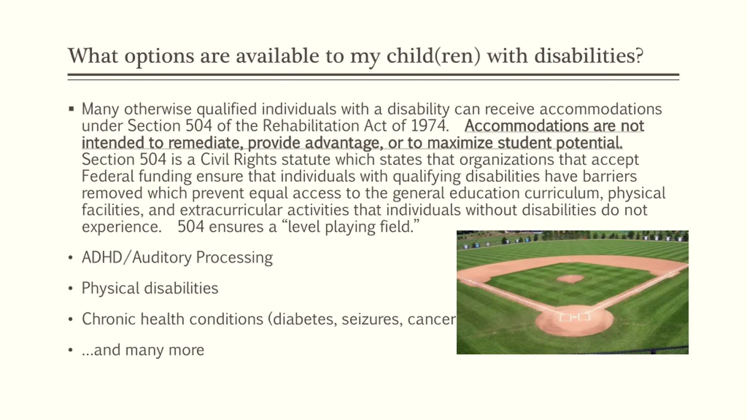 What options are available to my child(ren) with disabilities? Many otherwise qualified individuals with a disability can receive accommodations under Section 504 of the Rehabilitation Act of 1974. Accommodations are not intended to remediate, provide advantage, or to maximize student potential. intended to remediate, provide advantage, or to maximize student potential. Section 504 is a Civil Rights statute which states that organizations that accept Federal funding ensure that individuals with qualifying disabilities have barriers removed which prevent equal access to the general education curriculum, physical facilities, and extracurricular activities that individuals without disabilities do not experience. 504 ensures a level playing field. Accommodations are not ADHD/Auditory Processing Physical disabilities Chronic health conditions (diabetes, seizures, cancer) and many more