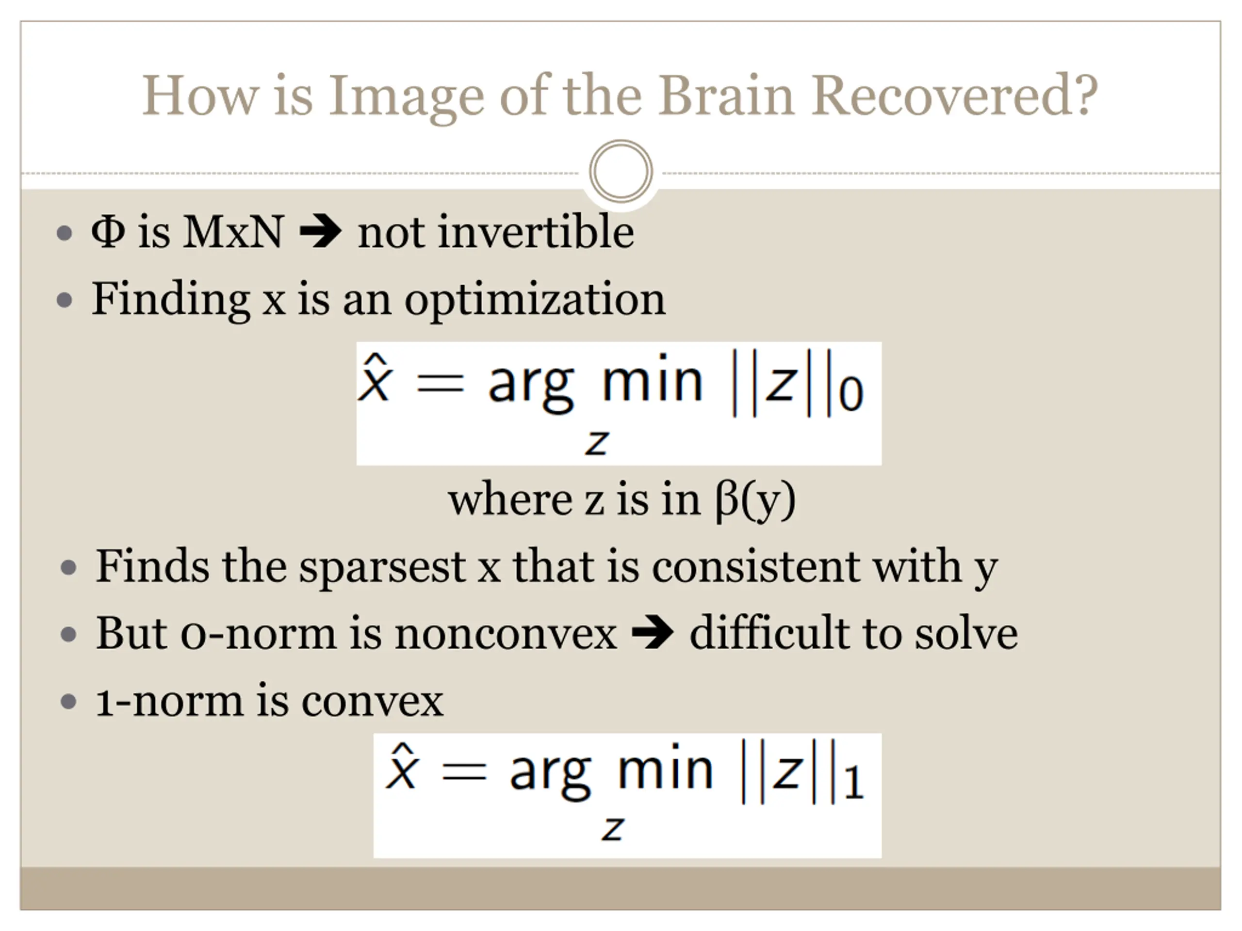 How is Image of the Brain Recovered? is MxN not invertible Finding x is an optimization where z is in (y) Finds the sparsest x that is consistent with y But 0-norm is nonconvex difficult to solve 1-norm is convex