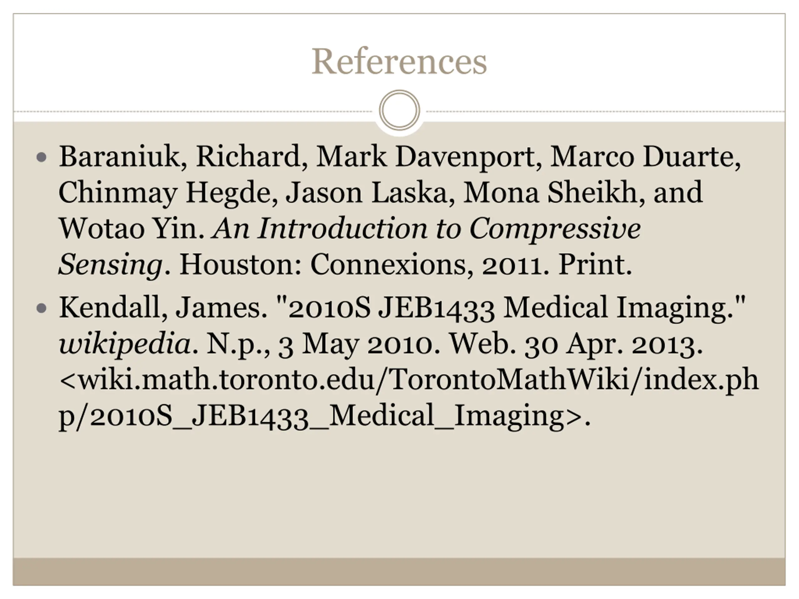 References Baraniuk, Richard, Mark Davenport, Marco Duarte, Chinmay Hegde, Jason Laska, Mona Sheikh, and Wotao Yin. An Introduction to Compressive Sensing. Houston: Connexions, 2011. Print. Kendall, James. "2010S JEB1433 Medical Imaging." wikipedia. N.p., 3 May 2010. Web. 30 Apr. 2013. <wiki.math.toronto.edu/TorontoMathWiki/index.ph p/2010S_JEB1433_Medical_Imaging>.