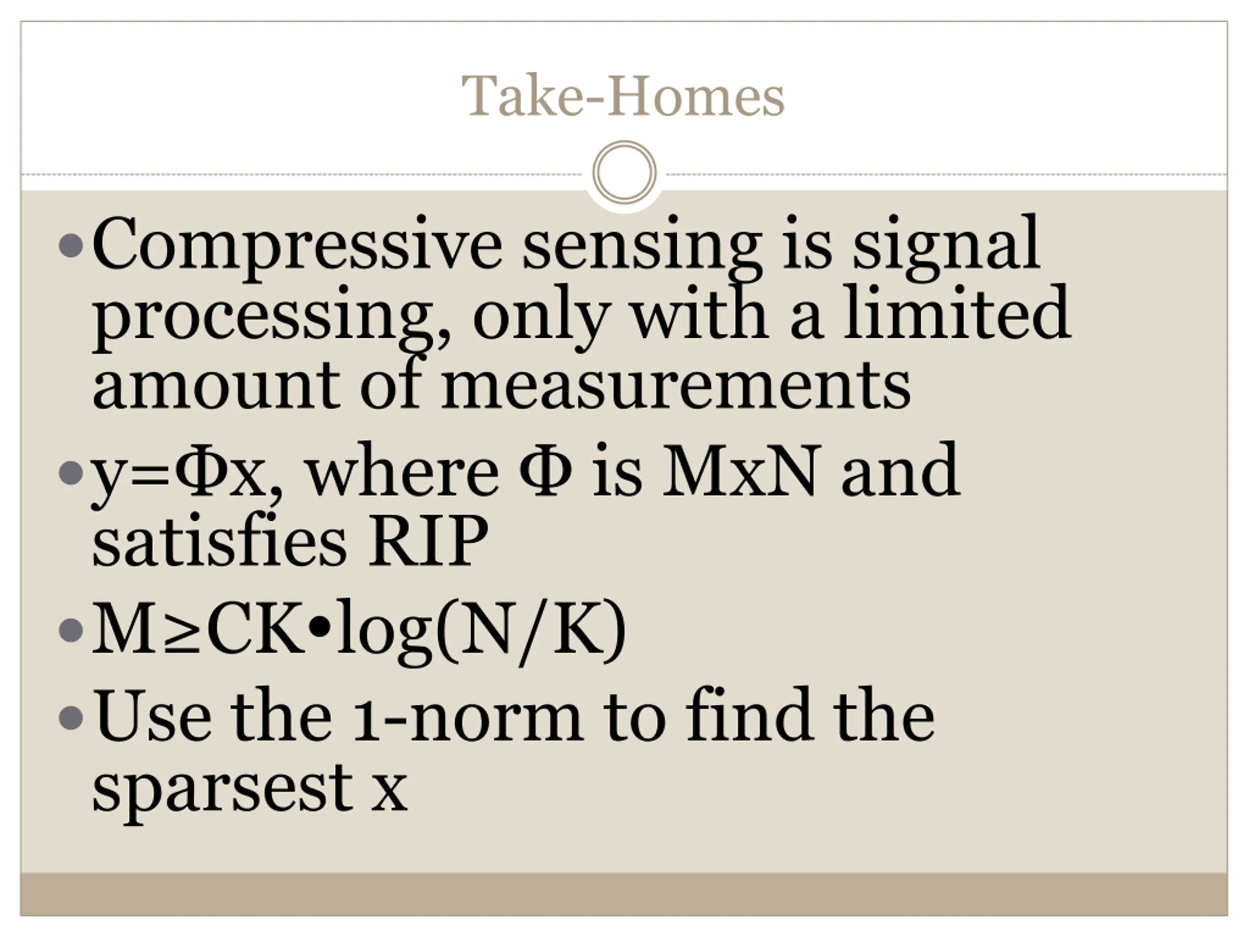 Take-Homes Compressive sensing is signal processing, only with a limited amount of measurements y= x, where is MxN and satisfies RIP M CK log(N/K) Use the 1-norm to find the sparsest x