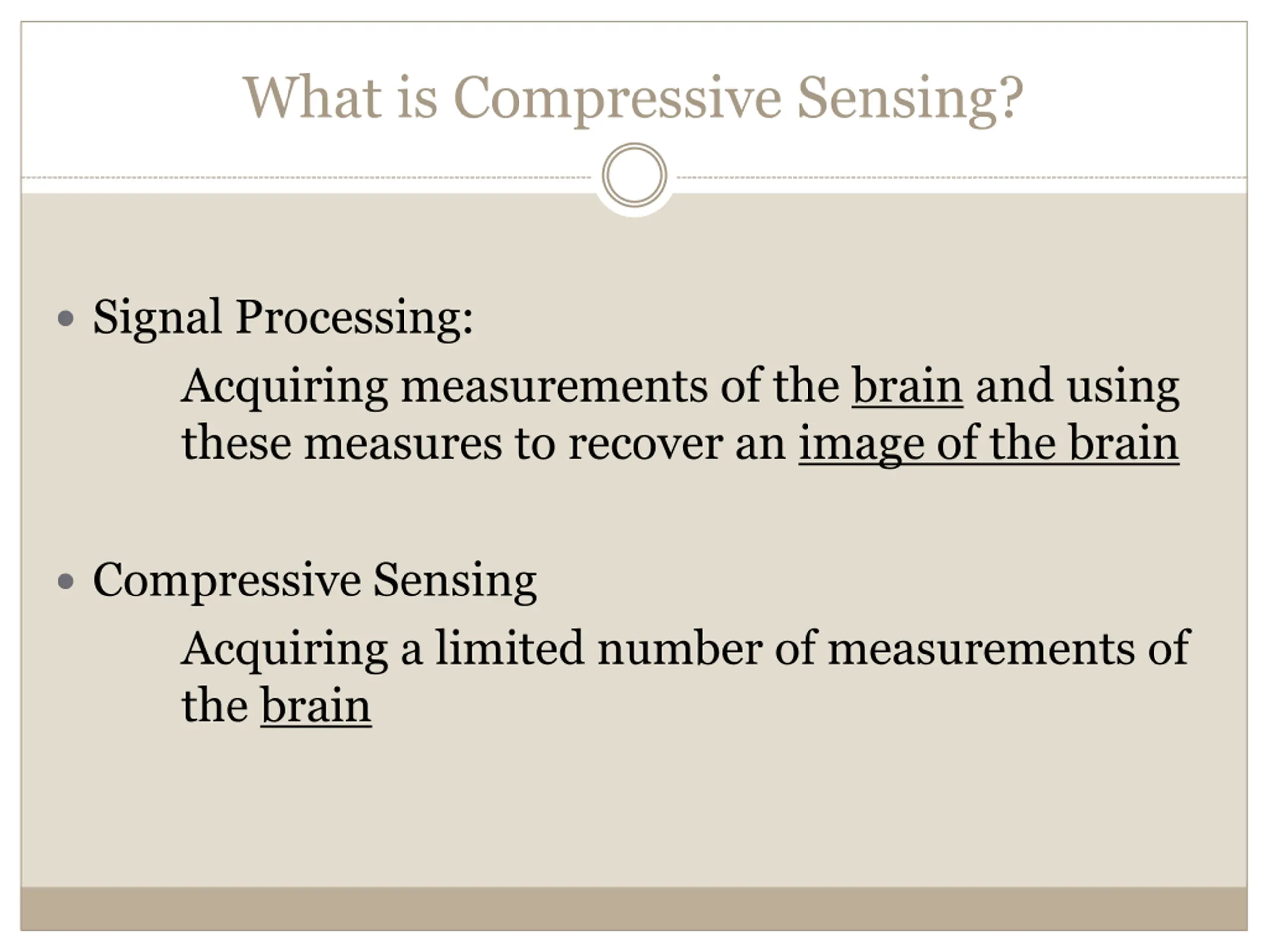 What is Compressive Sensing? Signal Processing: Acquiring measurements of the brain and using these measures to recover an image of the brain Compressive Sensing Acquiring a limited number of measurements of the brain