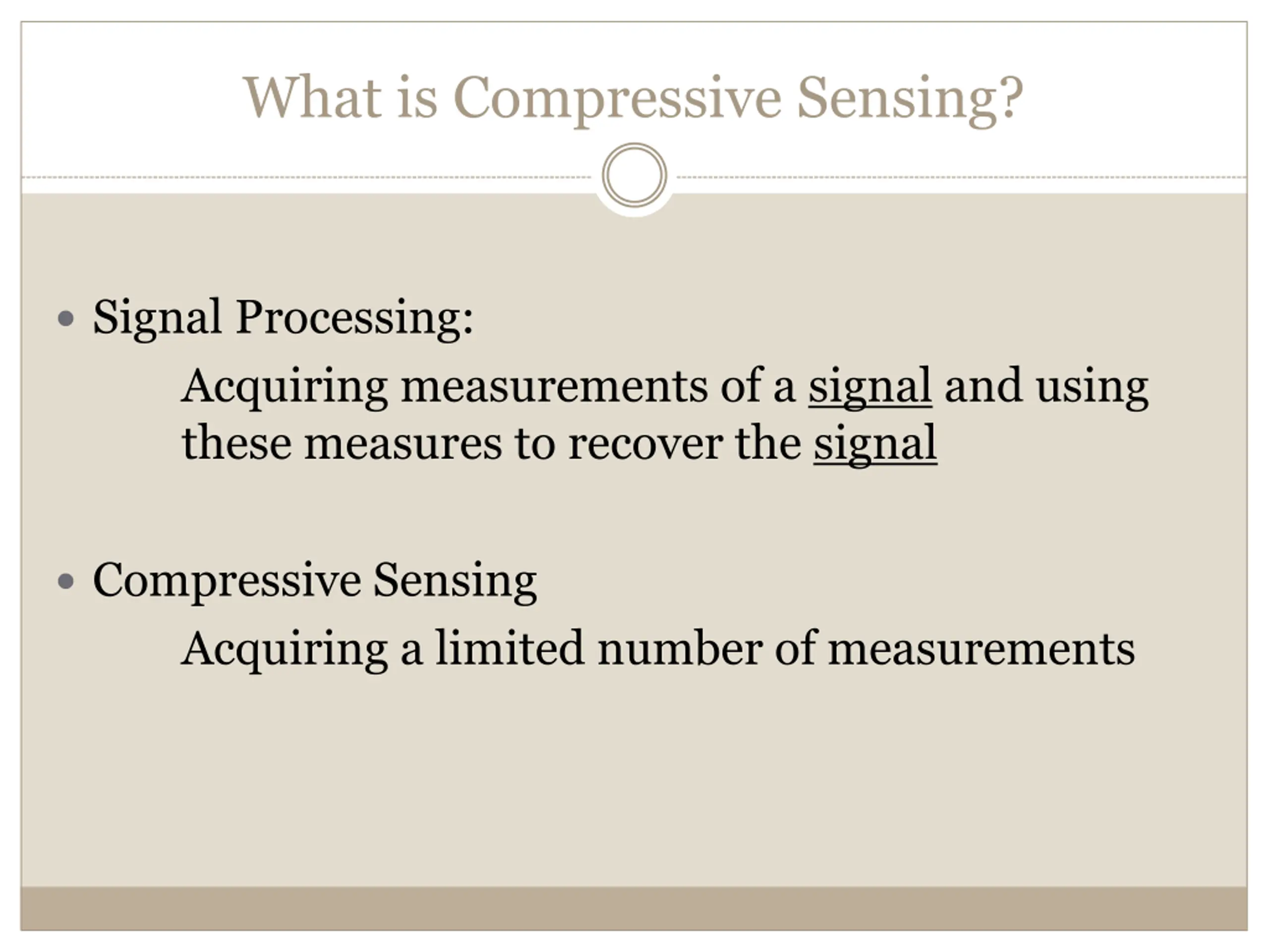 What is Compressive Sensing? Signal Processing: Acquiring measurements of a signal and using these measures to recover the signal Compressive Sensing Acquiring a limited number of measurements