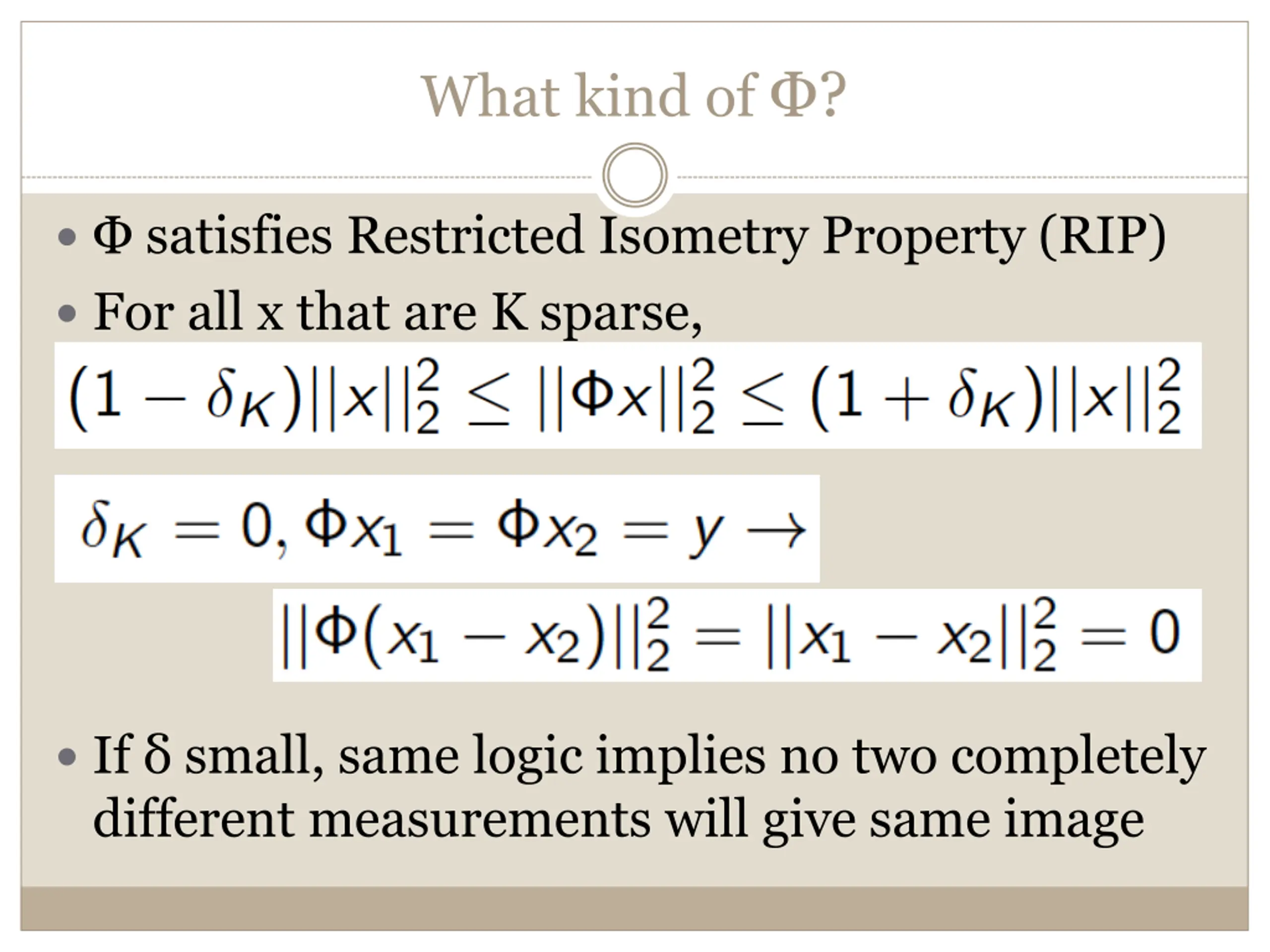 What kind of ? satisfies Restricted Isometry Property (RIP) For all x that are K sparse, If small, same logic implies no two completely different measurements will give same image