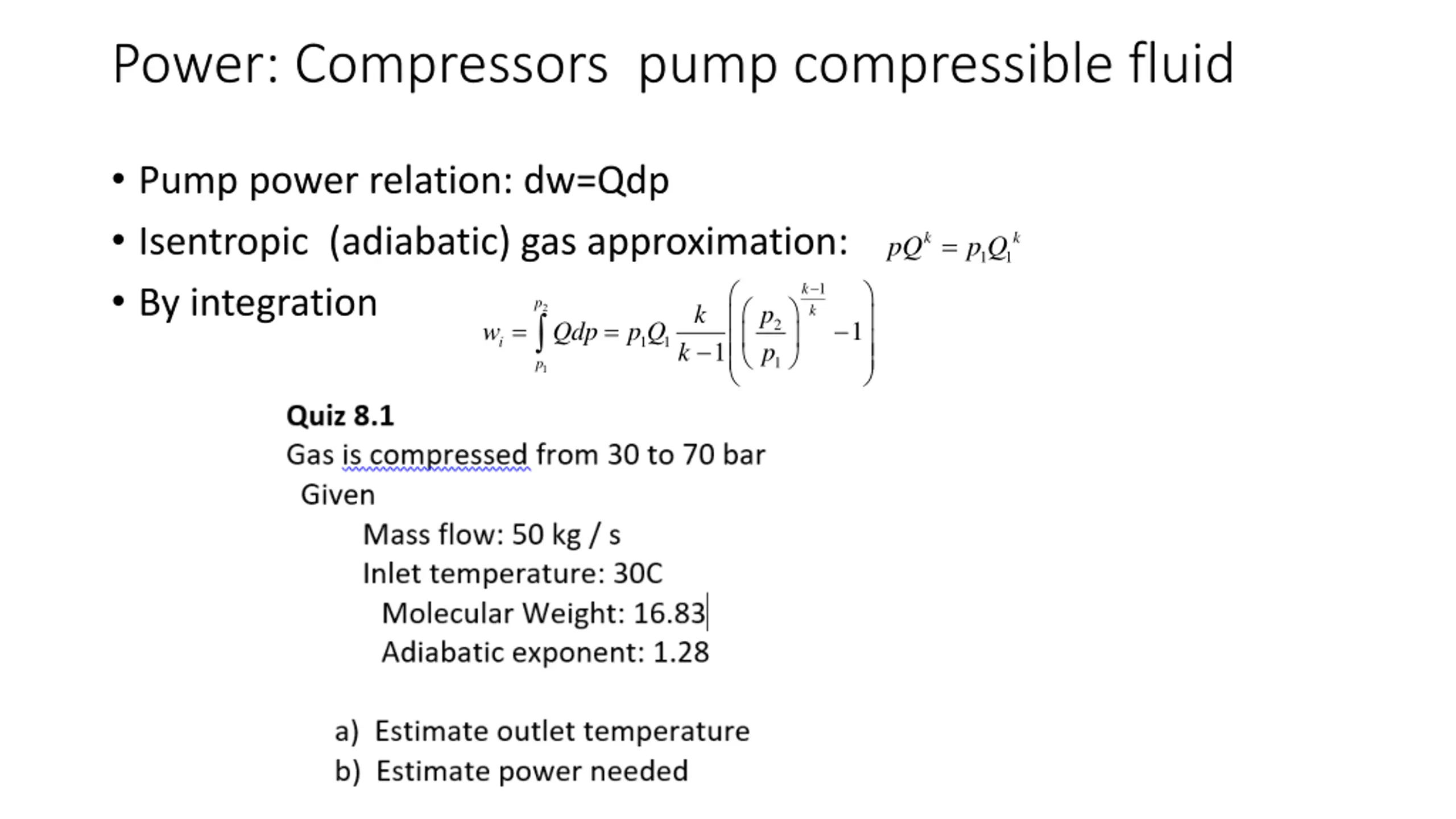 Power: Compressors pump compressible fluid Pump power relation: dw=Qdp Isentropic (adiabatic) gas approximation: By integration = k k pQ pQ 1 1 1 k p p p k 2 k = = 2 1 w Qdp p Q 1 1 i 1 k 1 p 1