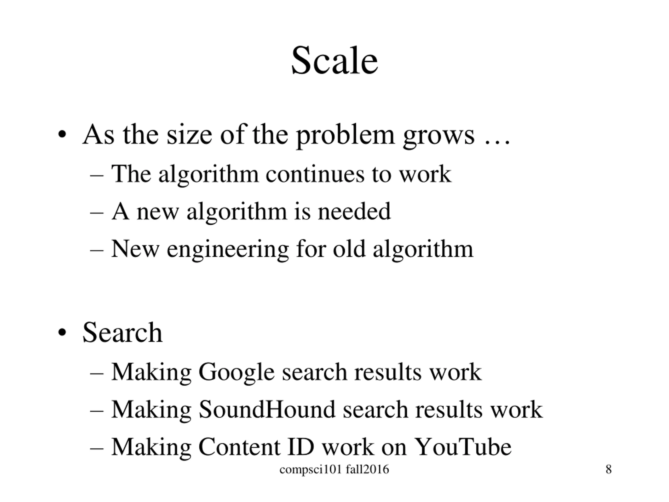Scale As the size of the problem grows The algorithm continues to work A new algorithm is needed New engineering for old algorithm Search Making Google search results work Making SoundHound search results work Making Content ID work on YouTube compsci101 fall2016 8