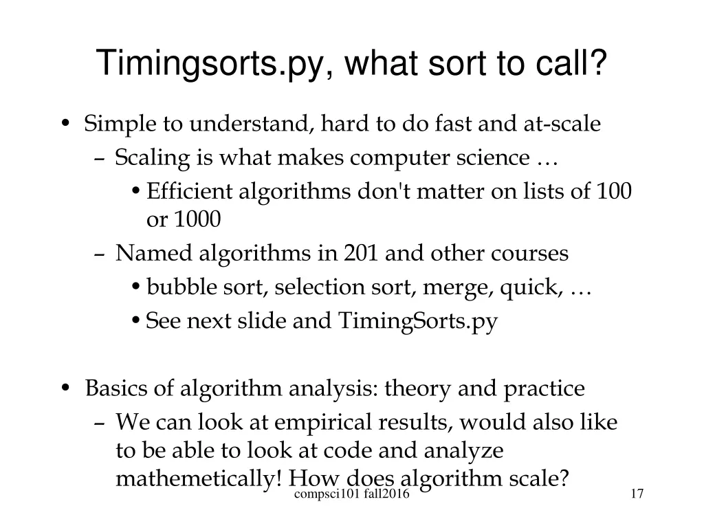 Timingsorts.py, what sort to call? Simple to understand, hard to do fast and at-scale Scaling is what makes computer science Efficient algorithms don't matter on lists of 100 or 1000 Named algorithms in 201 and other courses bubble sort, selection sort, merge, quick, See next slide and TimingSorts.py Basics of algorithm analysis: theory and practice We can look at empirical results, would also like to be able to look at code and analyze mathemetically! How does algorithm scale? compsci101 fall2016 17
