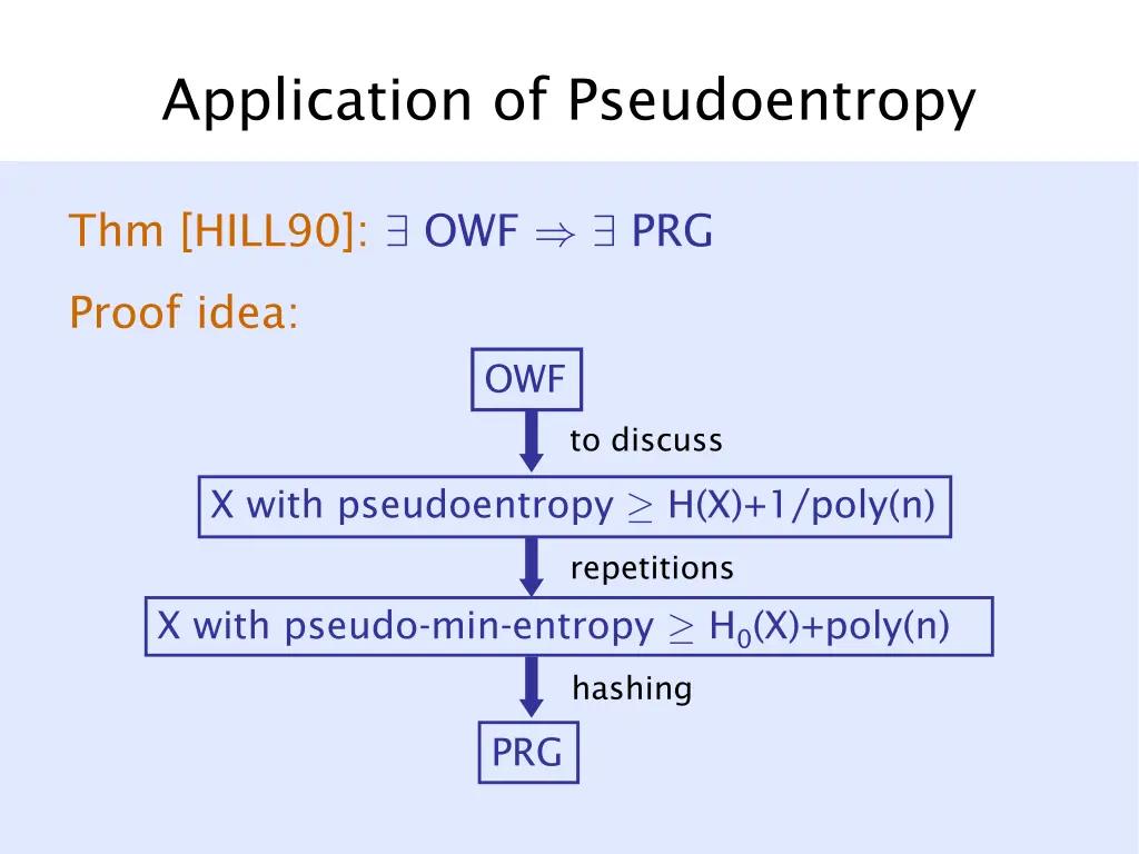 Application of Pseudoentropy Thm [HILL90]: 9 OWF )9 PRG Proof idea: OWF to discuss X with pseudoentropy H(X)+1/poly(n) repetitions X with pseudo-min-entropy H0(X)+poly(n) hashing PRG