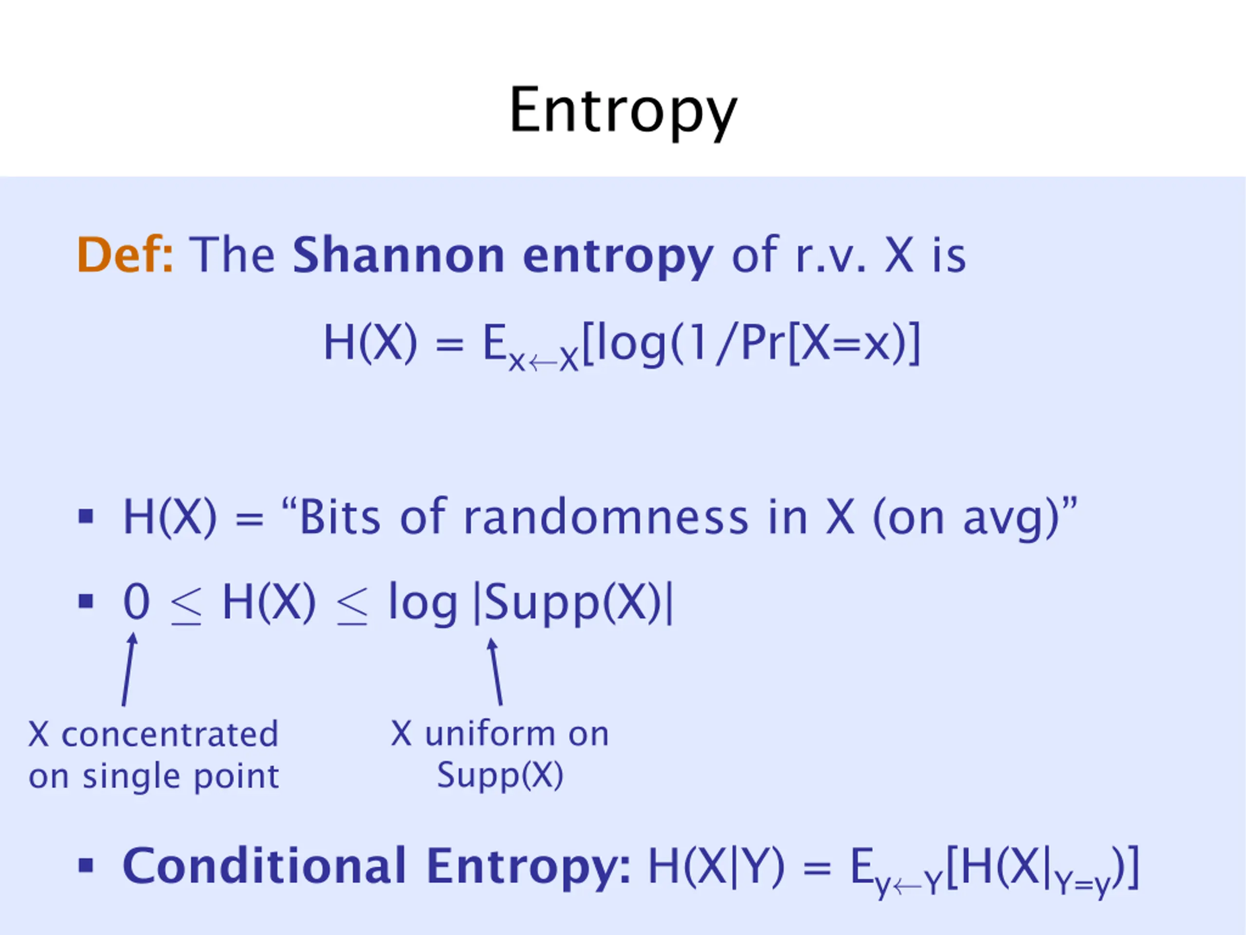 Entropy Def: The Shannon entropy of r.v. X is H(X) = Ex X[log(1/Pr[X=x)] H(X) = Bits of randomness in X (on avg) 0 H(X) log|Supp(X)| X uniform on Supp(X) X concentrated on single point Conditional Entropy: H(X|Y) = Ey Y[H(X|Y=y)]