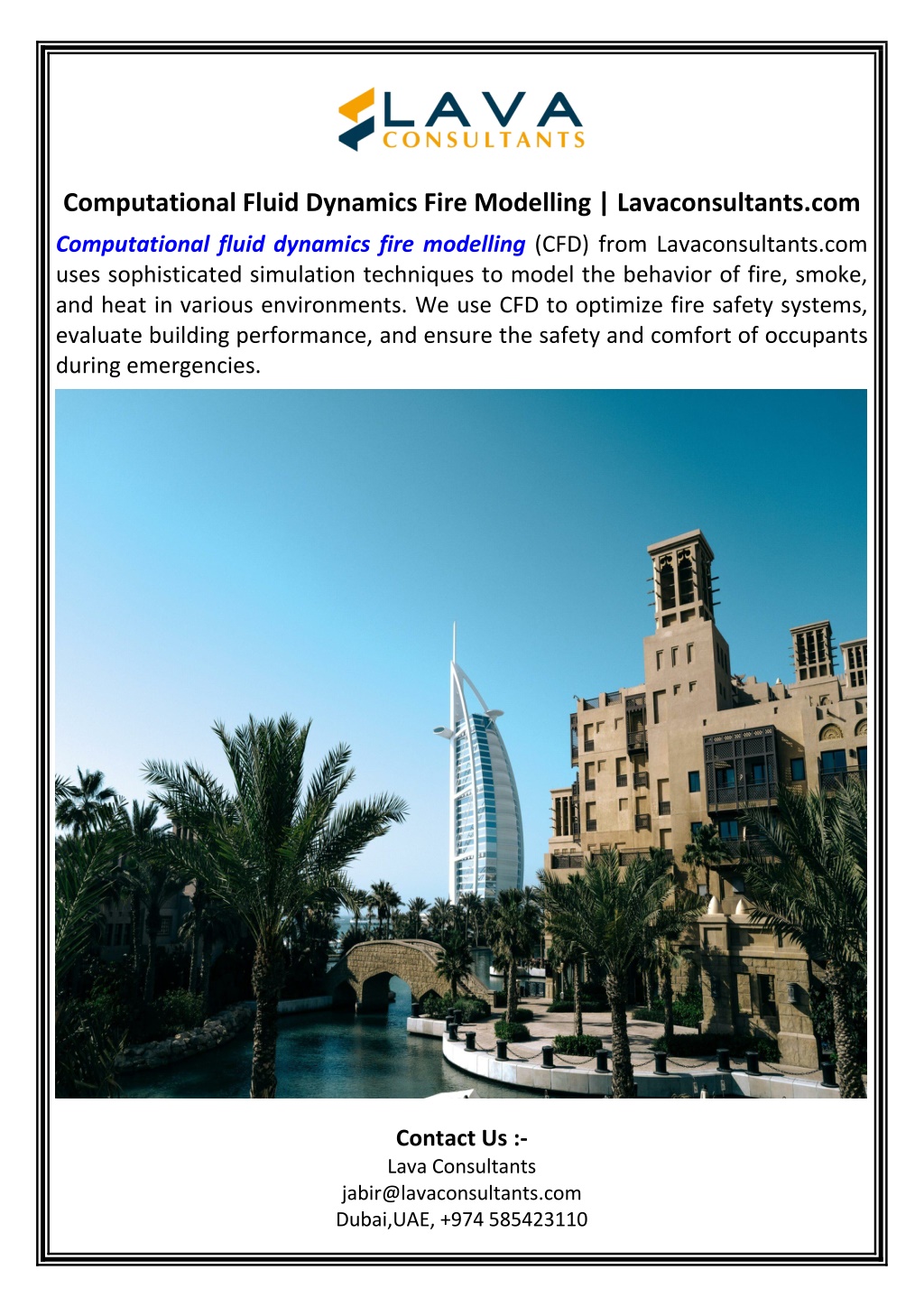 Computational Fluid Dynamics Fire Modelling | Lavaconsultants.com Computational fluid dynamics fire modelling (CFD) from Lavaconsultants.com uses sophisticated simulation techniques to model the behavior of fire, smoke, and heat in various environments. We use CFD to optimize fire safety systems, evaluate building performance, and ensure the safety and comfort of occupants during emergencies. Contact Us :- Lava Consultants jabir@lavaconsultants.com Dubai,UAE, +974 585423110
