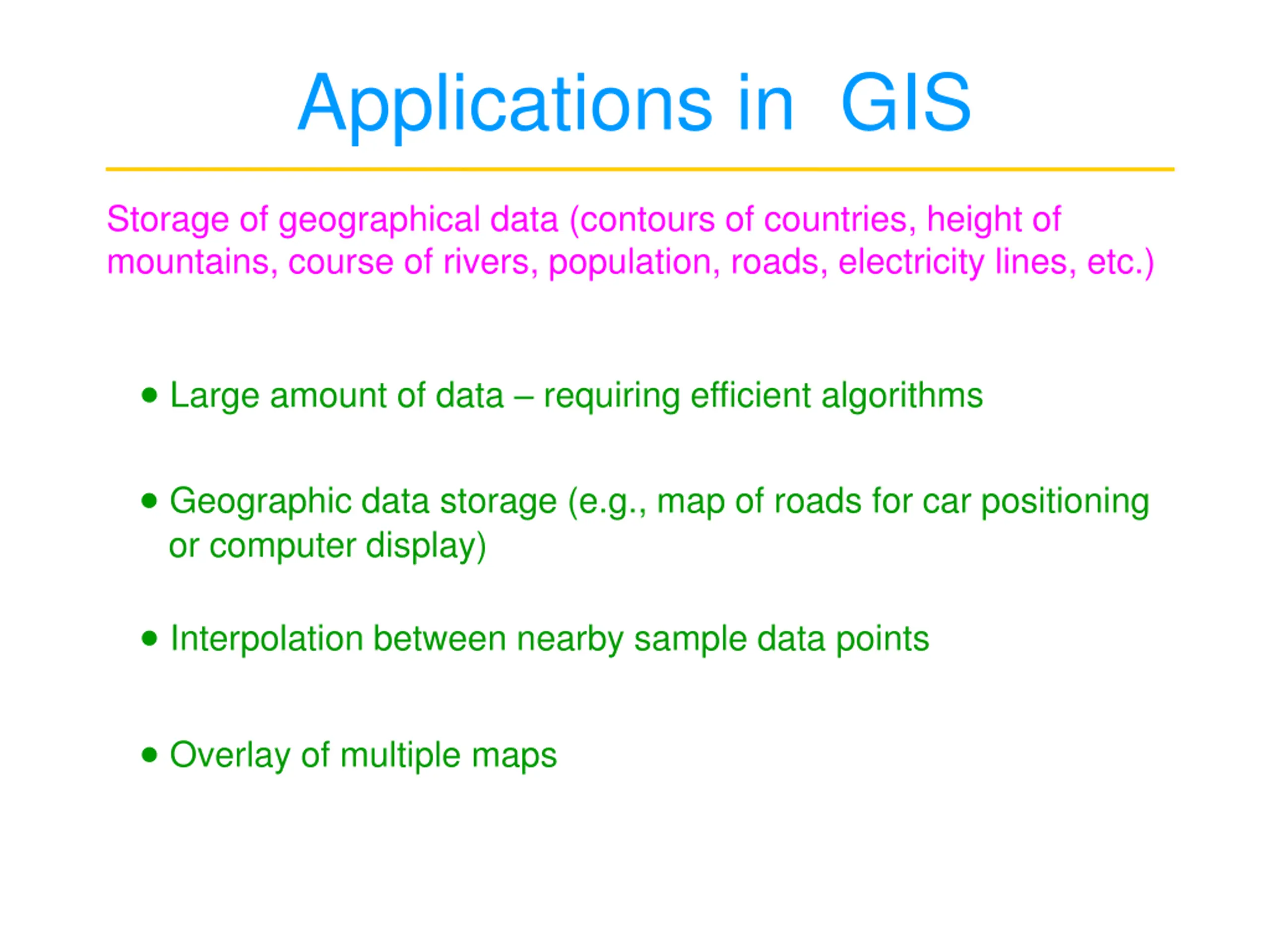 Applications in GIS Storage of geographical data (contours of countries, height of mountains, course of rivers, population, roads, electricity lines, etc.) Large amount of data requiring efficient algorithms Geographic data storage (e.g., map of roads for car positioning or computer display) Interpolation between nearby sample datapoints Overlay of multiple maps