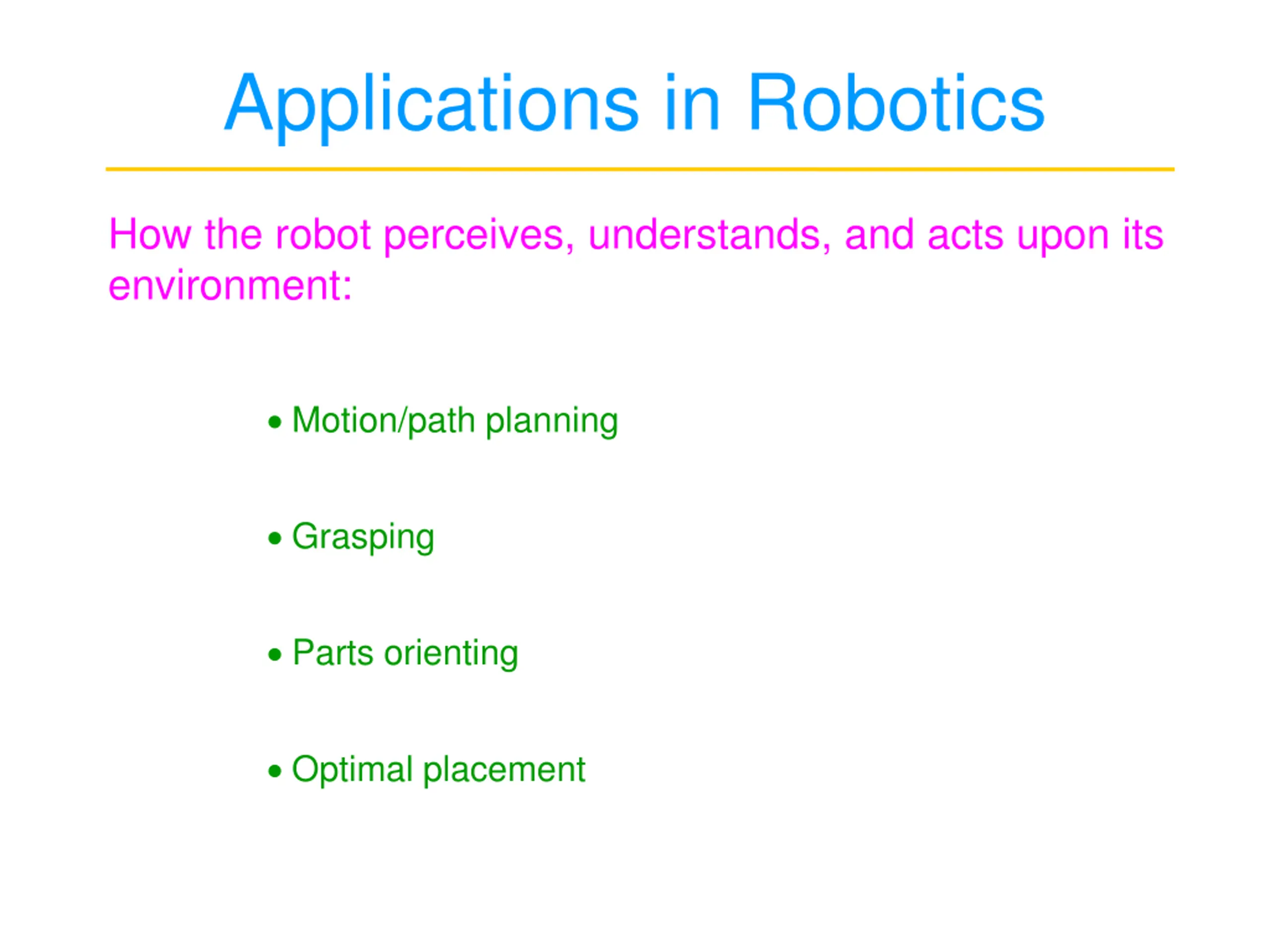 Applications in Robotics How the robot perceives, understands, and acts upon its environment: Motion/path planning Grasping Parts orienting Optimal placement