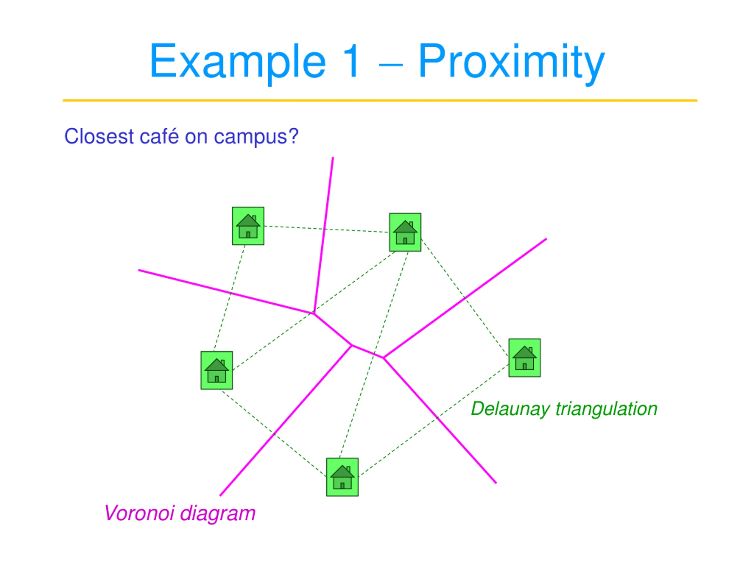 Example 1 Proximity Closest caf on campus? Delaunay triangulation Voronoi diagram