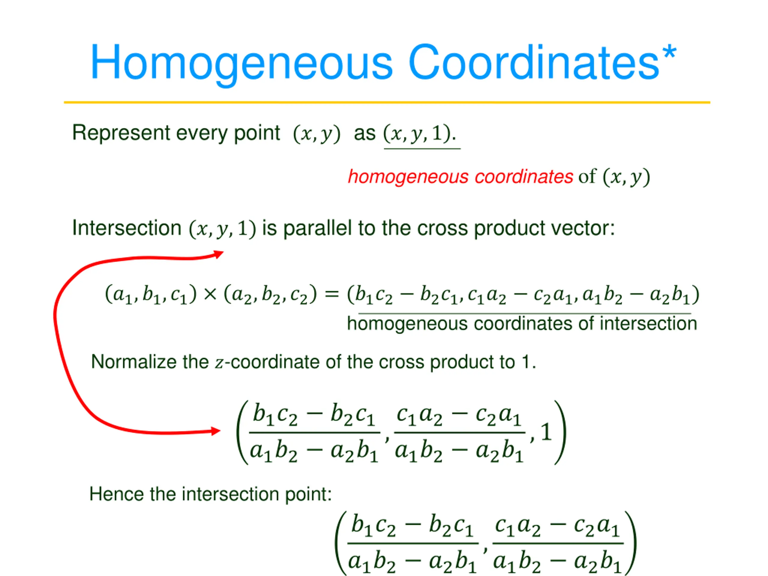 Advantages of Homogeneous Coordinates* Scaling independent: 25 17,23 17,1 25,23,17 , 50,46,34 , 25 17,23 17 all represent the same point Uniform handling of all cases (horizontal, perpendicular, parallel lines, etc.) No need to solve equations just take a cross product For more, see https://faculty.sites.iastate.edu/jia/files/inline-files/homogeneous-coords.pdf.