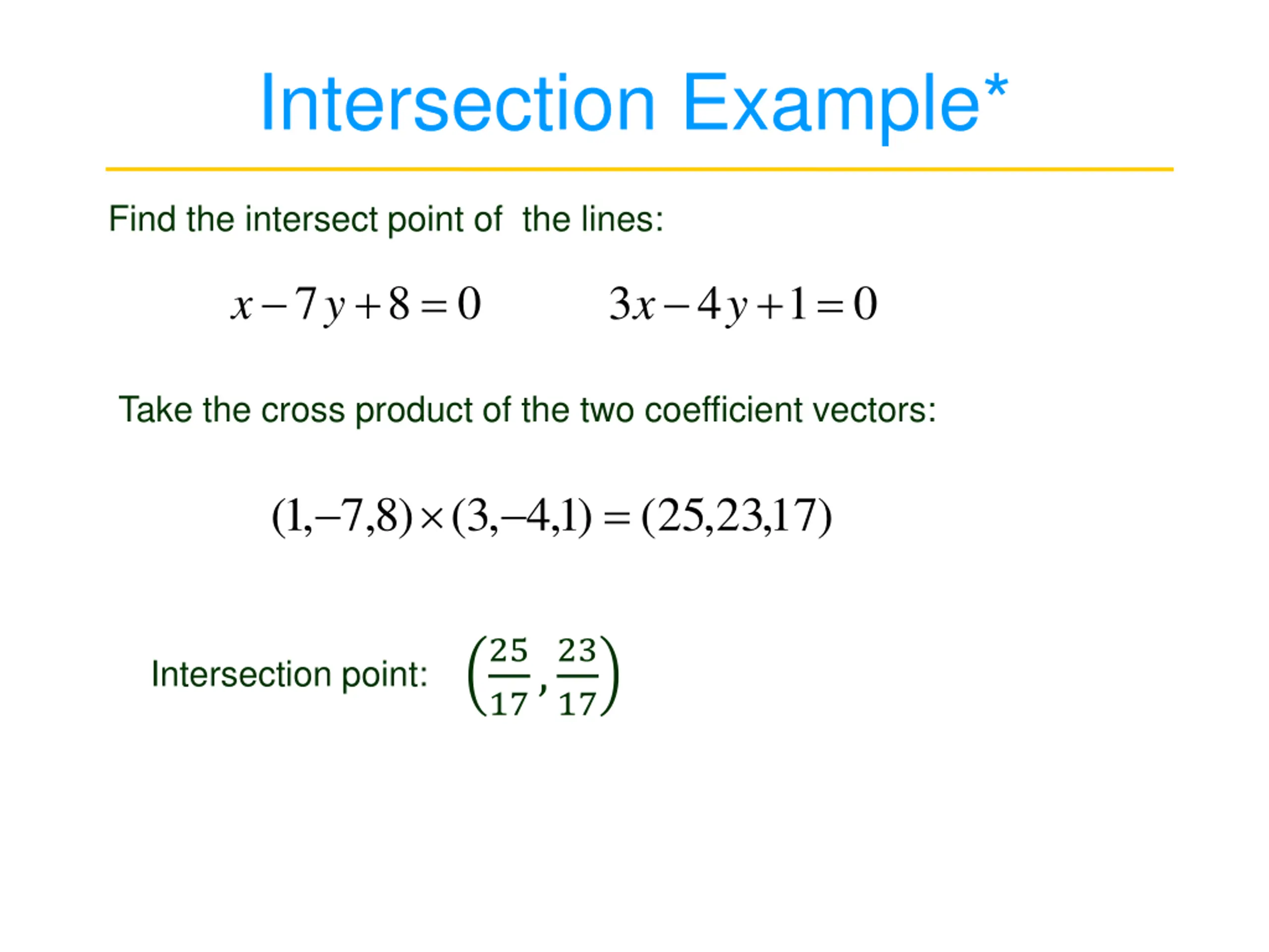 Intersection Example* Find the intersect point of the lines: y + = y + = 3 4 1 0 7 8 0 x x Take the cross product of the two coefficient vectors: ) 8 , 7 , 3 ( ) 1 , 4 = , 1 ( ( 25 , 23 17 , ) 25 17,23 17 Intersection point: