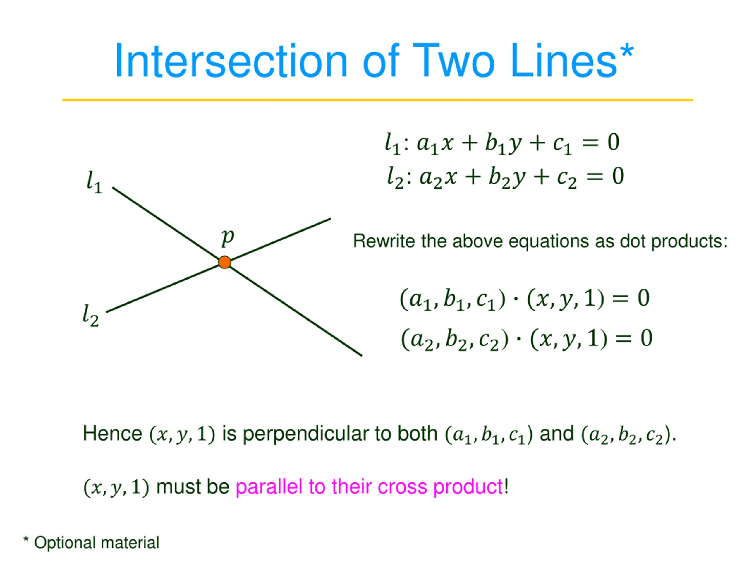Intersection of Two Lines* ?1: ?1? + ?1? + ?1= 0 ?2: ?2? + ?2? + ?2= 0 ?1 ? Rewrite the above equations as dot products: (?1,?1,?1) (?,?,1) = 0 (?2,?2,?2) (?,?,1) = 0 ?2 Hence (?,?,1) is perpendicular to both (?1,?1,?1) and (?2,?2,?2). (?,?,1) must be parallel to their cross product! * Optional material