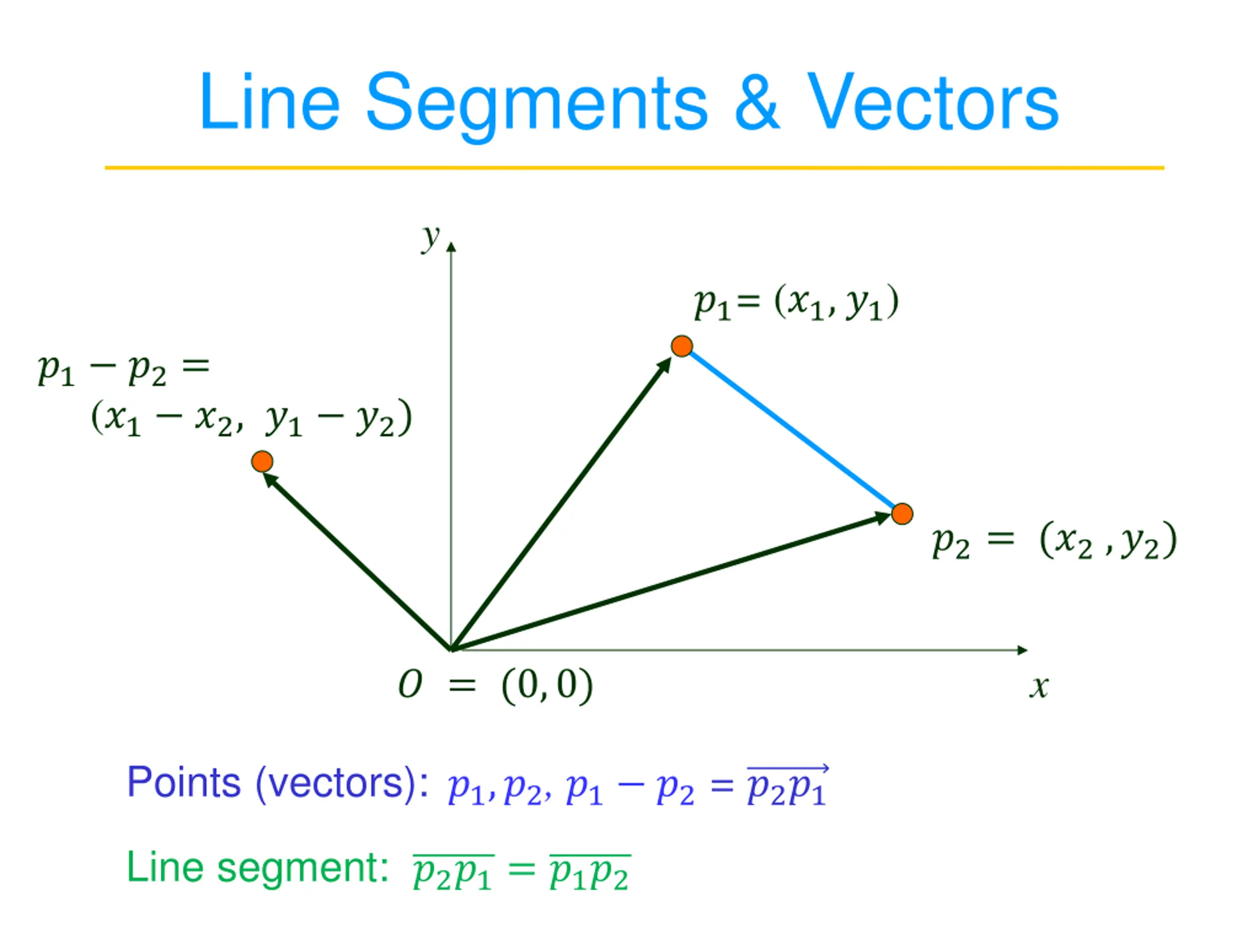 Line Segments & Vectors y ?1= (?1, ?1) ?1 ?2= (?1 ?2, ?1 ?2) ?2= (?2 ,?2) x ? = (0,0) Points (vectors): ?1,?2, ?1 ?2 = ?2?1 Line segment: ?2?1= ?1?2