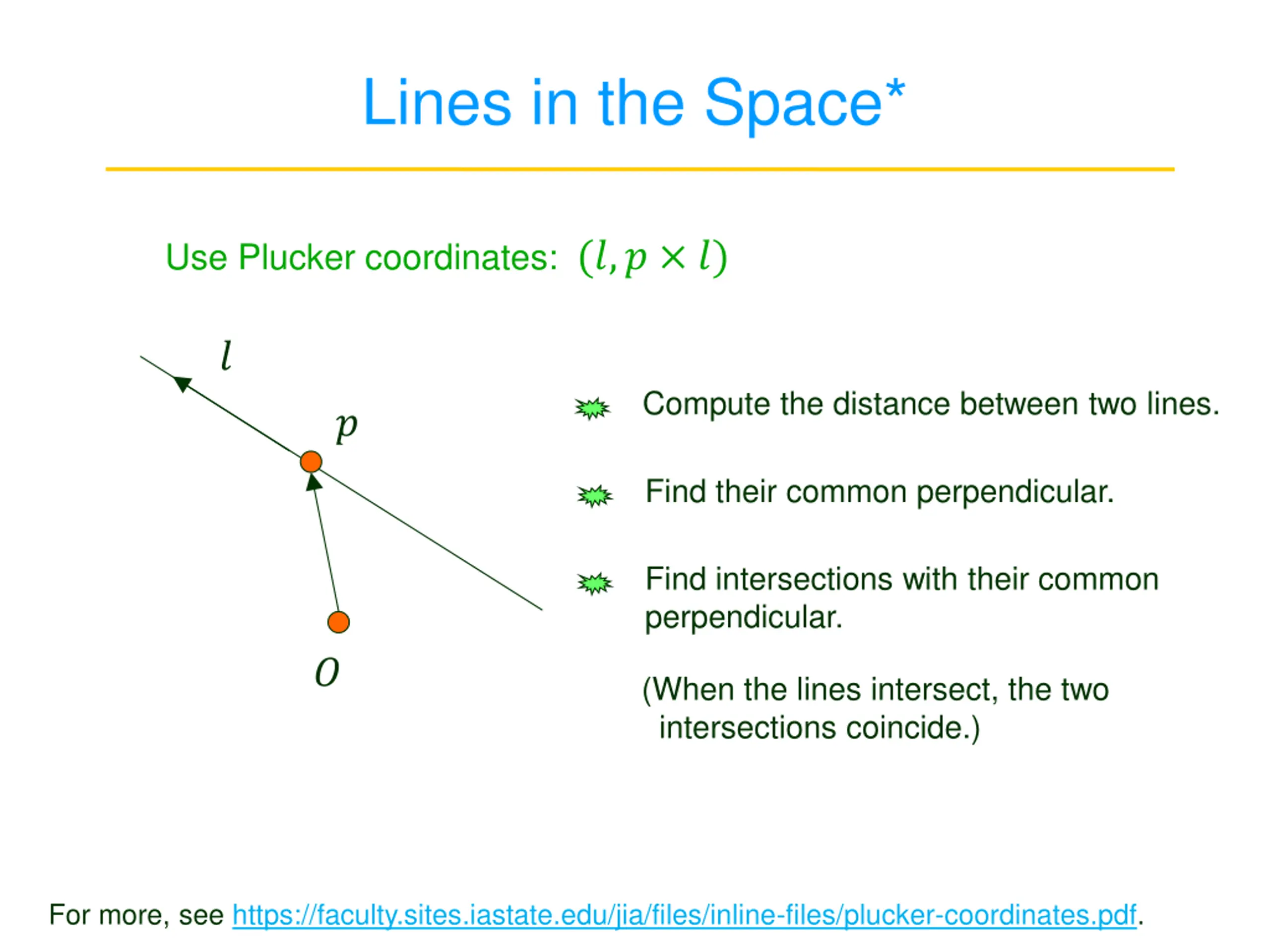 Lines in the Space* Use Plucker coordinates: (?,? ?) ? Compute the distance between two lines. ? Find their common perpendicular. Find intersections with their common perpendicular. ? (When the lines intersect, the two intersections coincide.) For more, see https://faculty.sites.iastate.edu/jia/files/inline-files/plucker-coordinates.pdf.