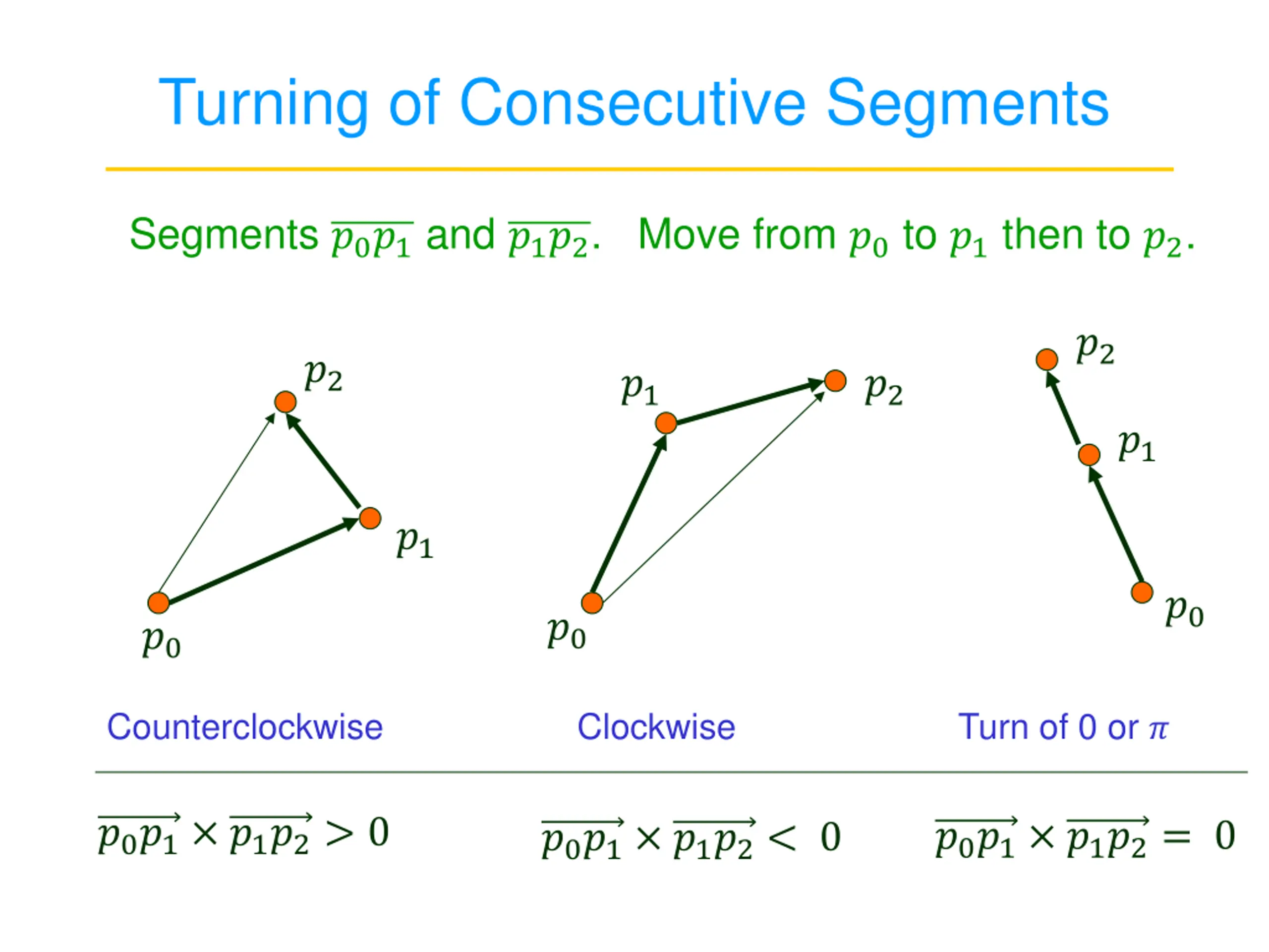 Turning of Consecutive Segments Segments ?0?1 and ?1?2. Move from ?0 to ?1 then to ?2. ?2 ?2 ?1 ?2 ?1 ?1 ?0 ?0 ?0 Counterclockwise Clockwise Turn of 0 or ? ?0?1 ?1?2< 0 ?0?1 ?1?2> 0 ?0?1 ?1?2= 0