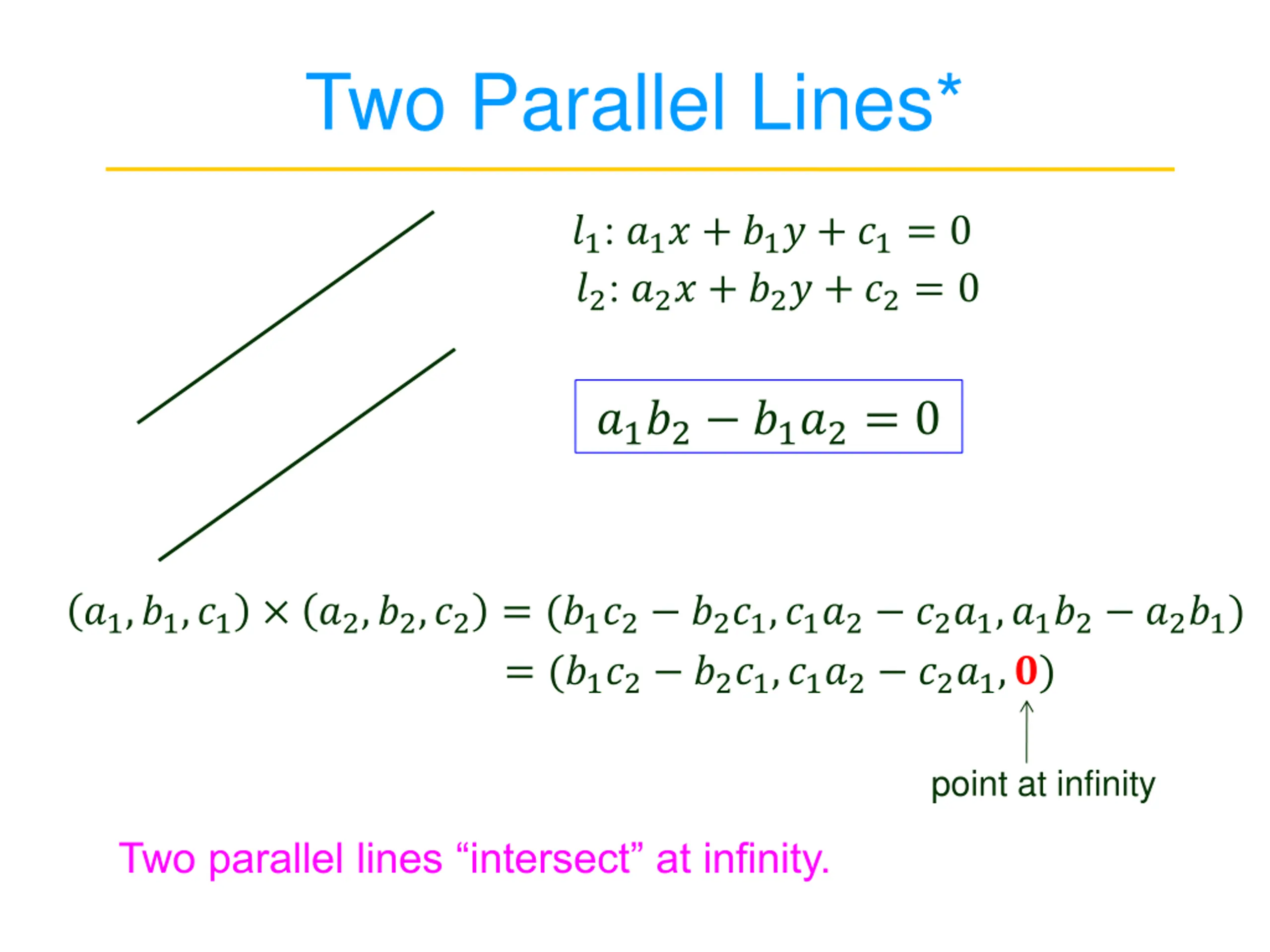 Two Parallel Lines* ?1: ?1? + ?1? + ?1= 0 ?2: ?2? + ?2? + ?2= 0 ?1?2 ?1?2= 0 ?1,?1,?1 ?2,?2,?2 = (?1?2 ?2?1,?1?2 ?2?1,?1?2 ?2?1) = (?1?2 ?2?1,?1?2 ?2?1,?) point at infinity Two parallel lines intersect at infinity.