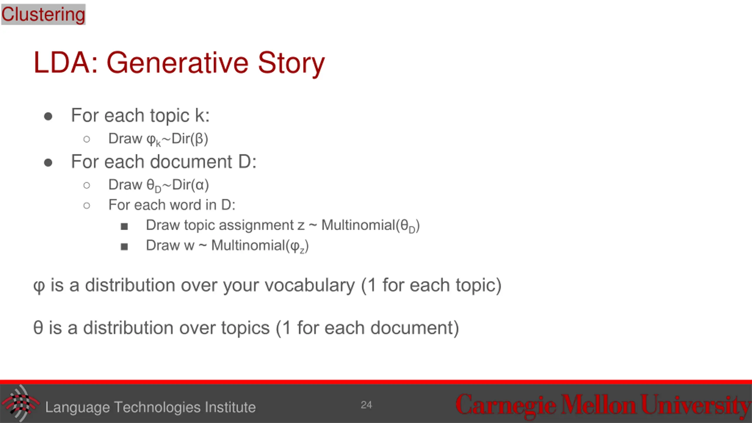 Clustering LDA: Generative Story For each topic k: Draw k Dir( ) For each document D: Draw D Dir( ) For each word in D: Draw topic assignment z ~ Multinomial( D) Draw w ~ Multinomial( z) is a distribution over your vocabulary (1 for each topic) is a distribution over topics (1 for each document) 24 Language Technologies Institute 24