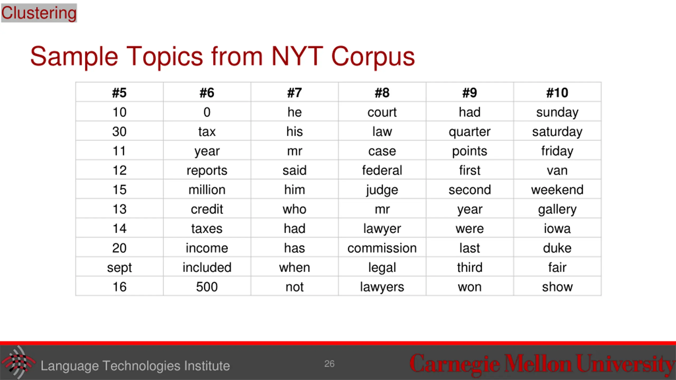 Clustering Sample Topics from NYT Corpus #5 10 30 11 12 15 13 14 20 sept 16 #6 0 tax year reports million credit taxes income included 500 #7 he his mr said him who had has when not #8 #9 had quarter points first second year were last third won #10 sunday saturday friday van weekend gallery iowa duke fair show court law case federal judge mr lawyer commission legal lawyers 26 Language Technologies Institute 26