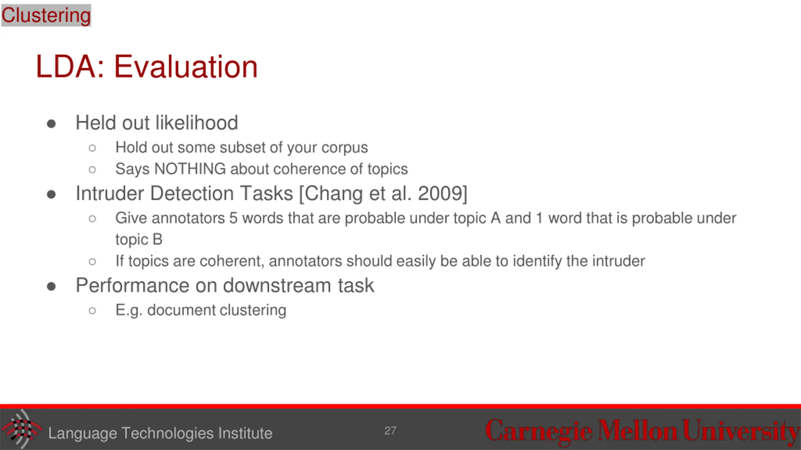 Clustering LDA: Evaluation Held out likelihood Hold out some subset of your corpus Says NOTHING about coherence of topics Intruder Detection Tasks [Chang et al. 2009] Give annotators 5 words that are probable under topic A and 1 word that is probable under topic B If topics are coherent, annotators should easily be able to identify the intruder Performance on downstream task E.g. document clustering 27 Language Technologies Institute 27