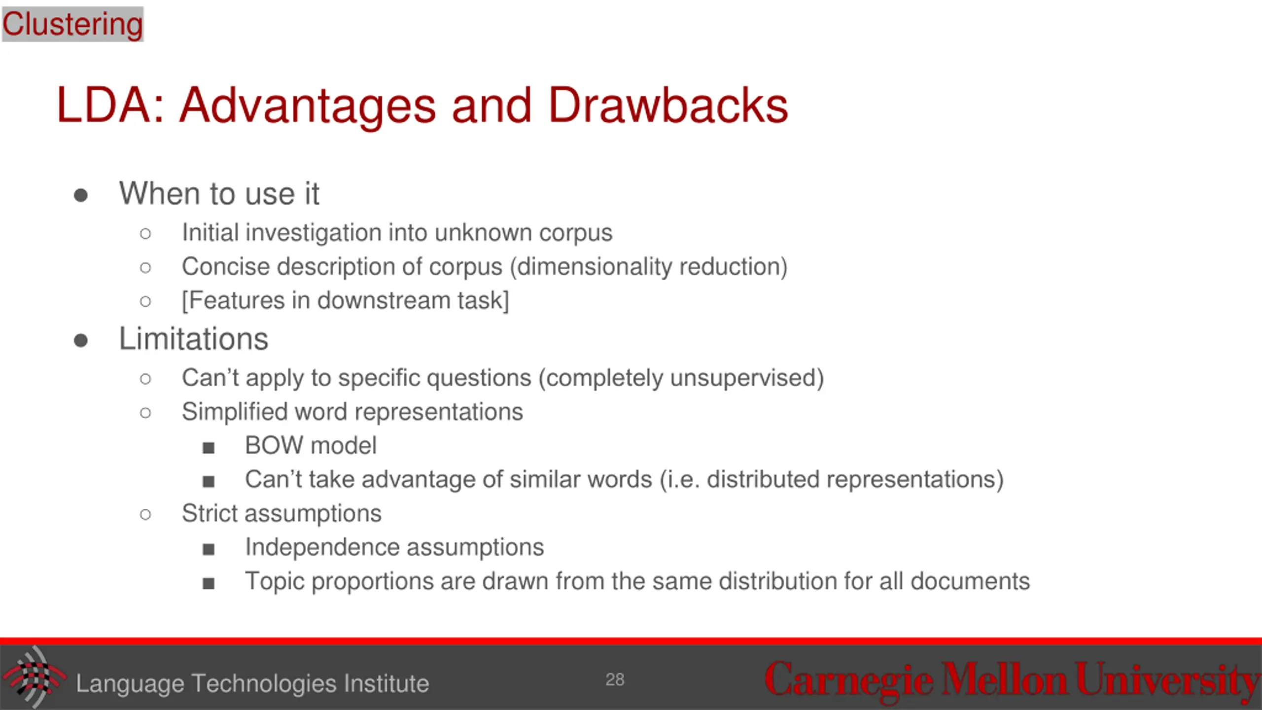 Clustering LDA: Advantages and Drawbacks When to use it Initial investigation into unknown corpus Concise description of corpus (dimensionality reduction) [Features in downstream task] Limitations Can t apply to specific questions (completely unsupervised) Simplified word representations BOW model Can t take advantage of similar words (i.e. distributed representations) Strict assumptions Independence assumptions Topic proportions are drawn from the same distribution for all documents 28 Language Technologies Institute 28