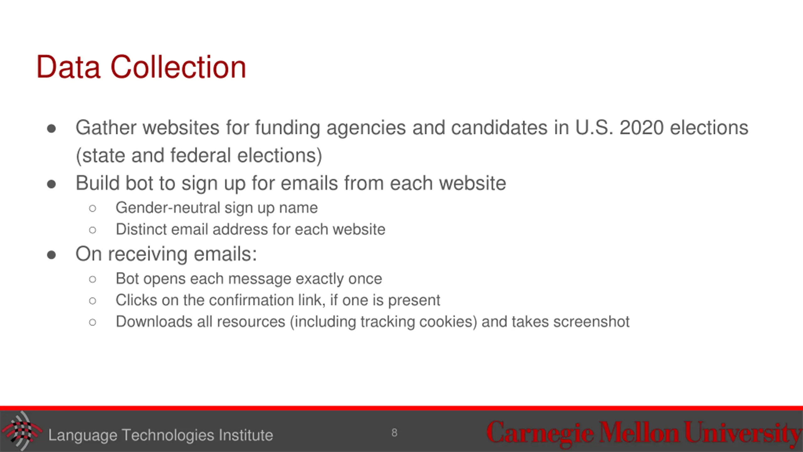 Data Collection Gather websites for funding agencies and candidates in U.S. 2020 elections (state and federal elections) Build bot to sign up for emails from each website Gender-neutral sign up name Distinct email address for each website On receiving emails: Bot opens each message exactly once Clicks on the confirmation link, if one is present Downloads all resources (including tracking cookies) and takes screenshot 8 Language Technologies Institute 8