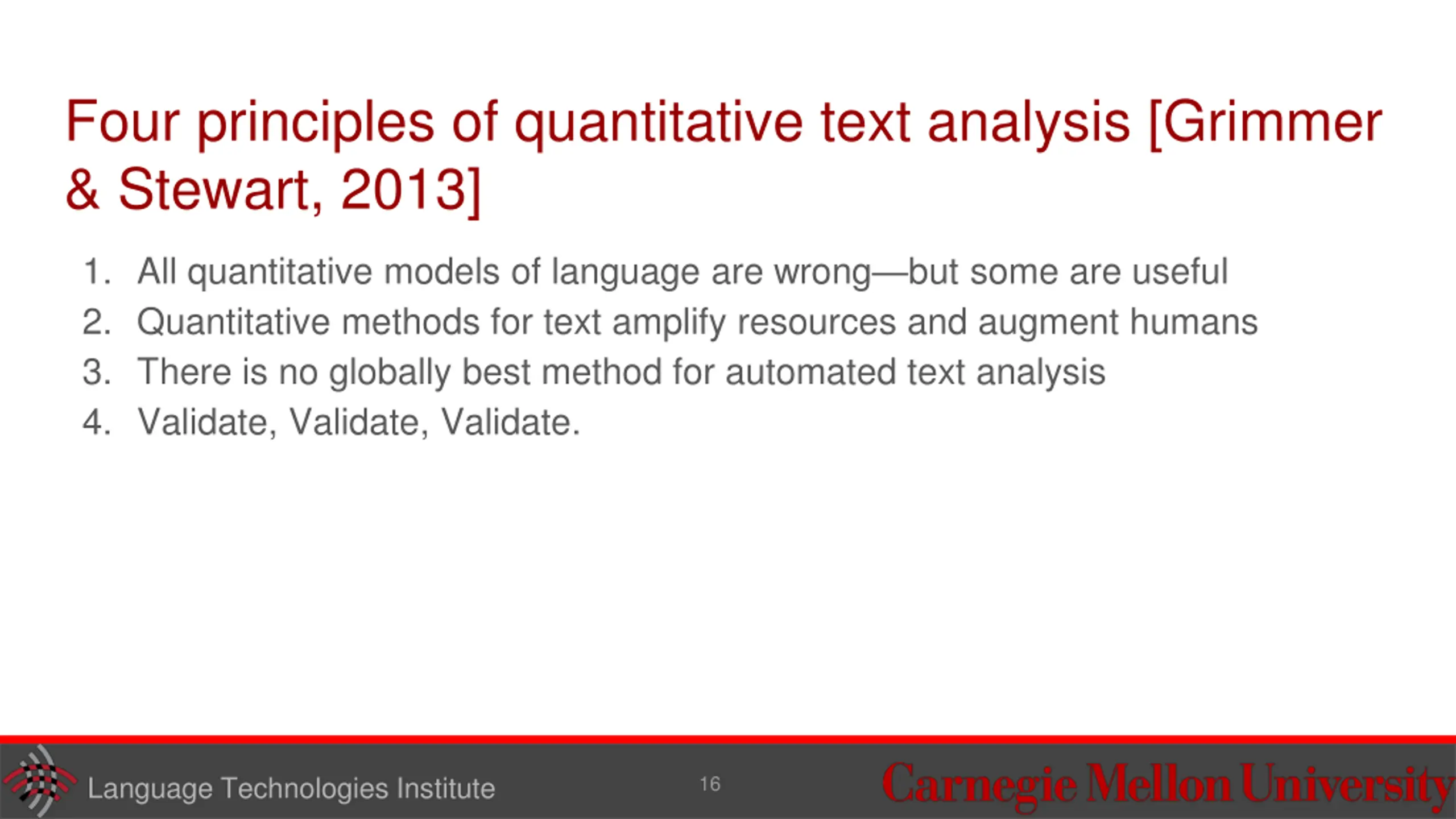 Four principles of quantitative text analysis [Grimmer & Stewart, 2013] 1. All quantitative models of language are wrong but some are useful 2. Quantitative methods for text amplify resources and augment humans 3. There is no globally best method for automated text analysis 4. Validate, Validate, Validate. 16 Language Technologies Institute 16