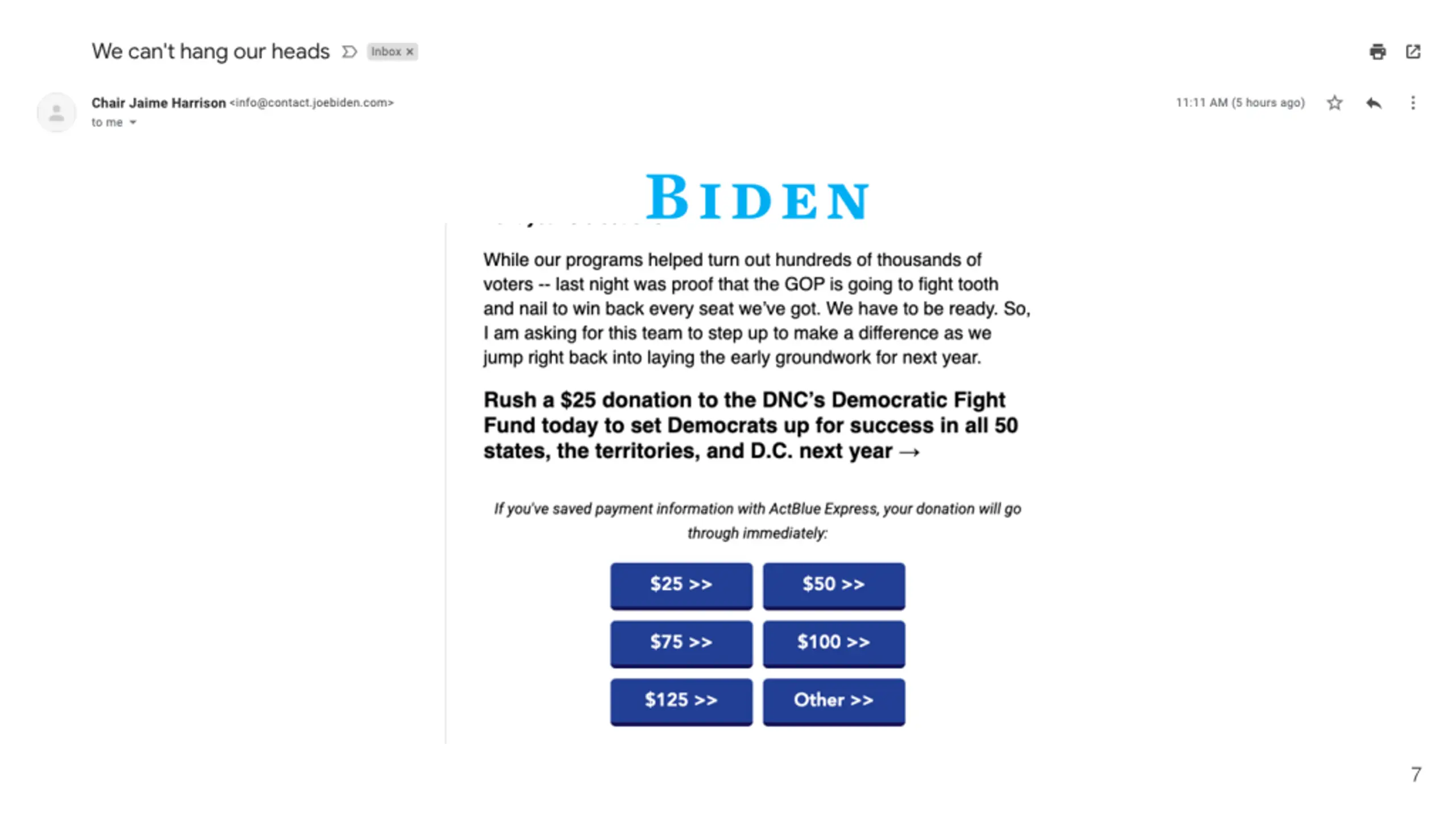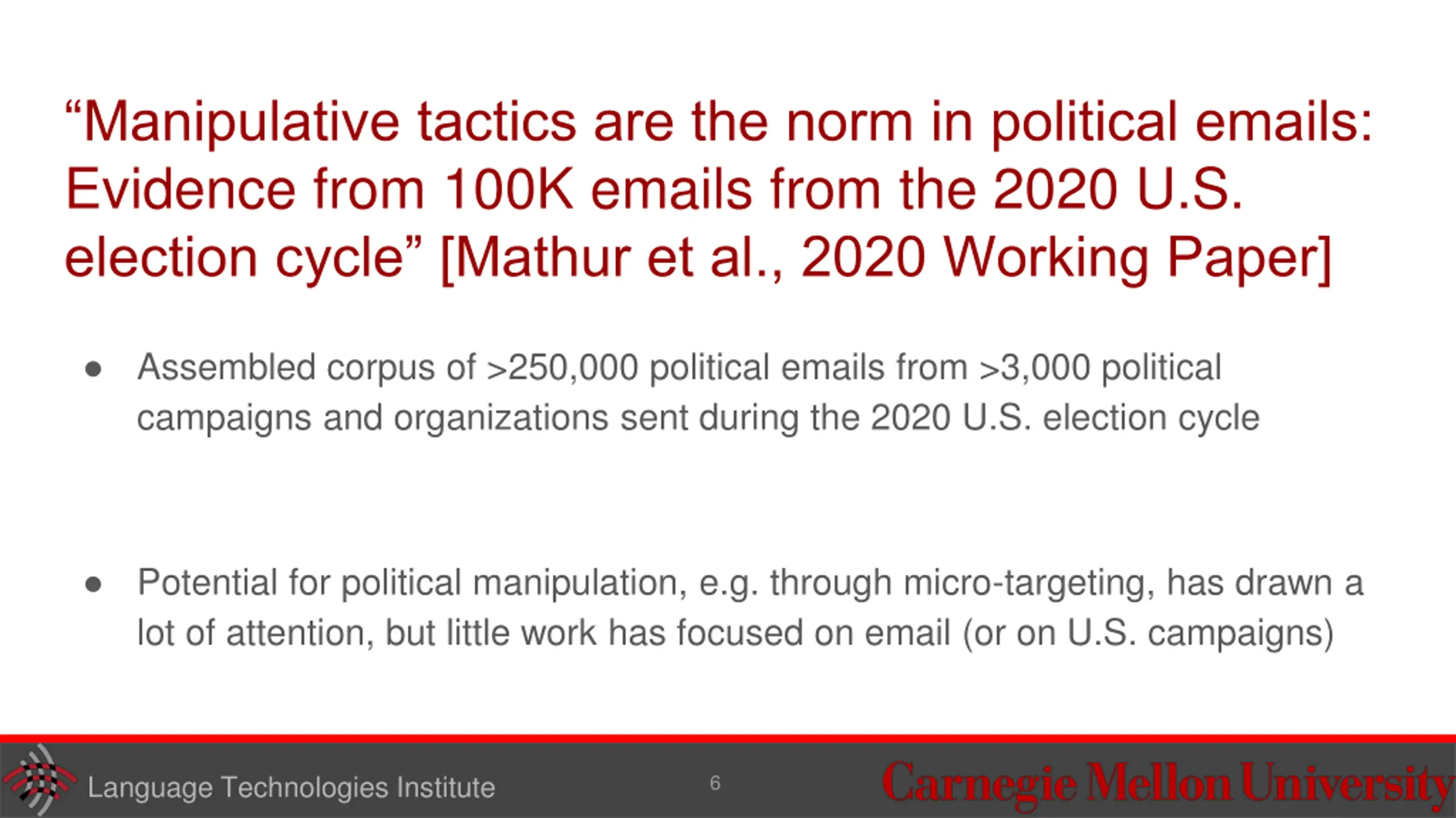 Manipulative tactics are the norm in political emails: Evidence from 100K emails from the 2020 U.S. election cycle [Mathur et al., 2020 Working Paper] Assembled corpus of >250,000 political emails from >3,000 political campaigns and organizations sent during the 2020 U.S. election cycle Potential for political manipulation, e.g. through micro-targeting, has drawn a lot of attention, but little work has focused on email (or on U.S. campaigns) 6 Language Technologies Institute 6