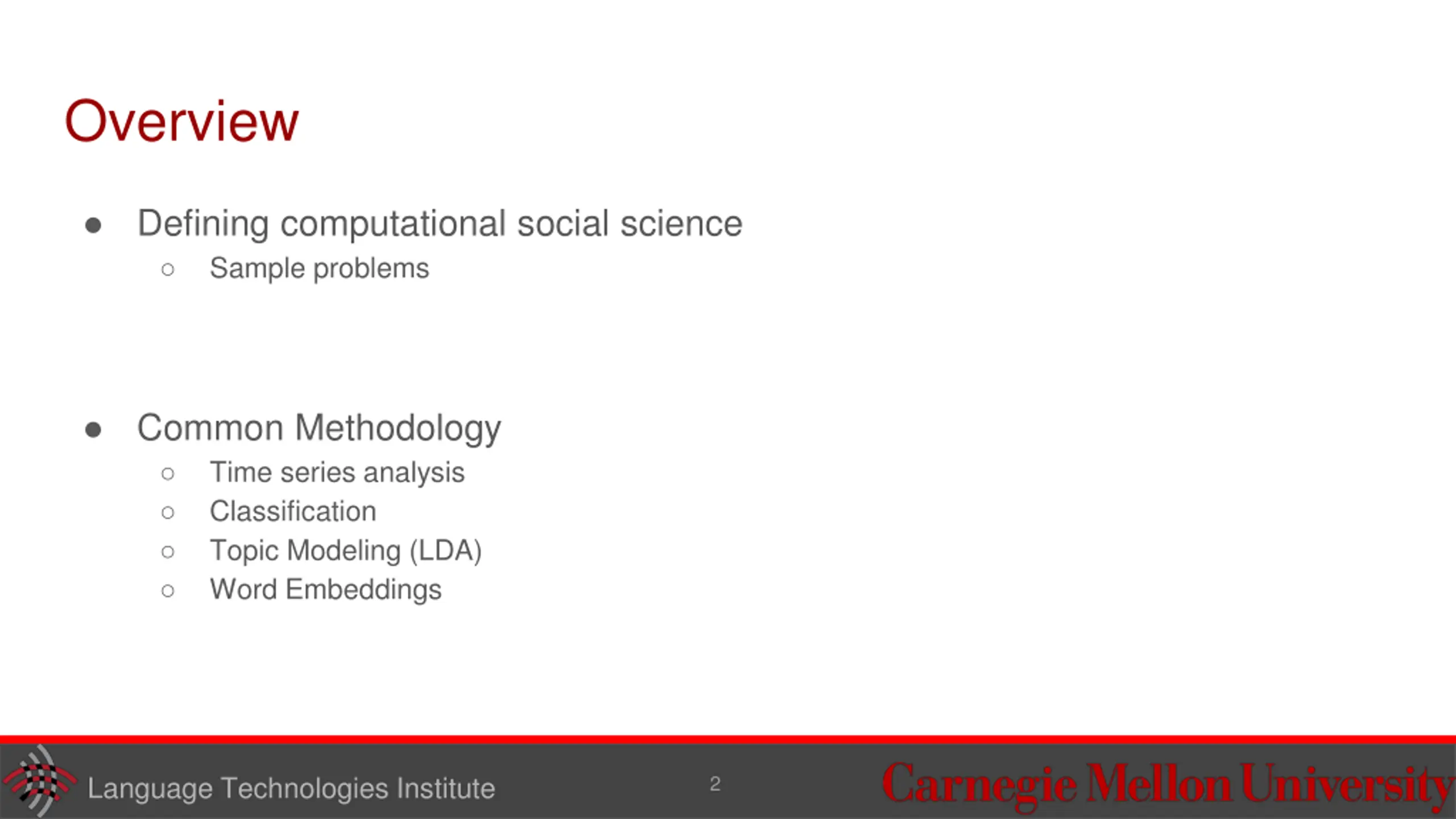 Overview Defining computational social science Sample problems Common Methodology Time series analysis Classification Topic Modeling (LDA) Word Embeddings 2 Language Technologies Institute 2