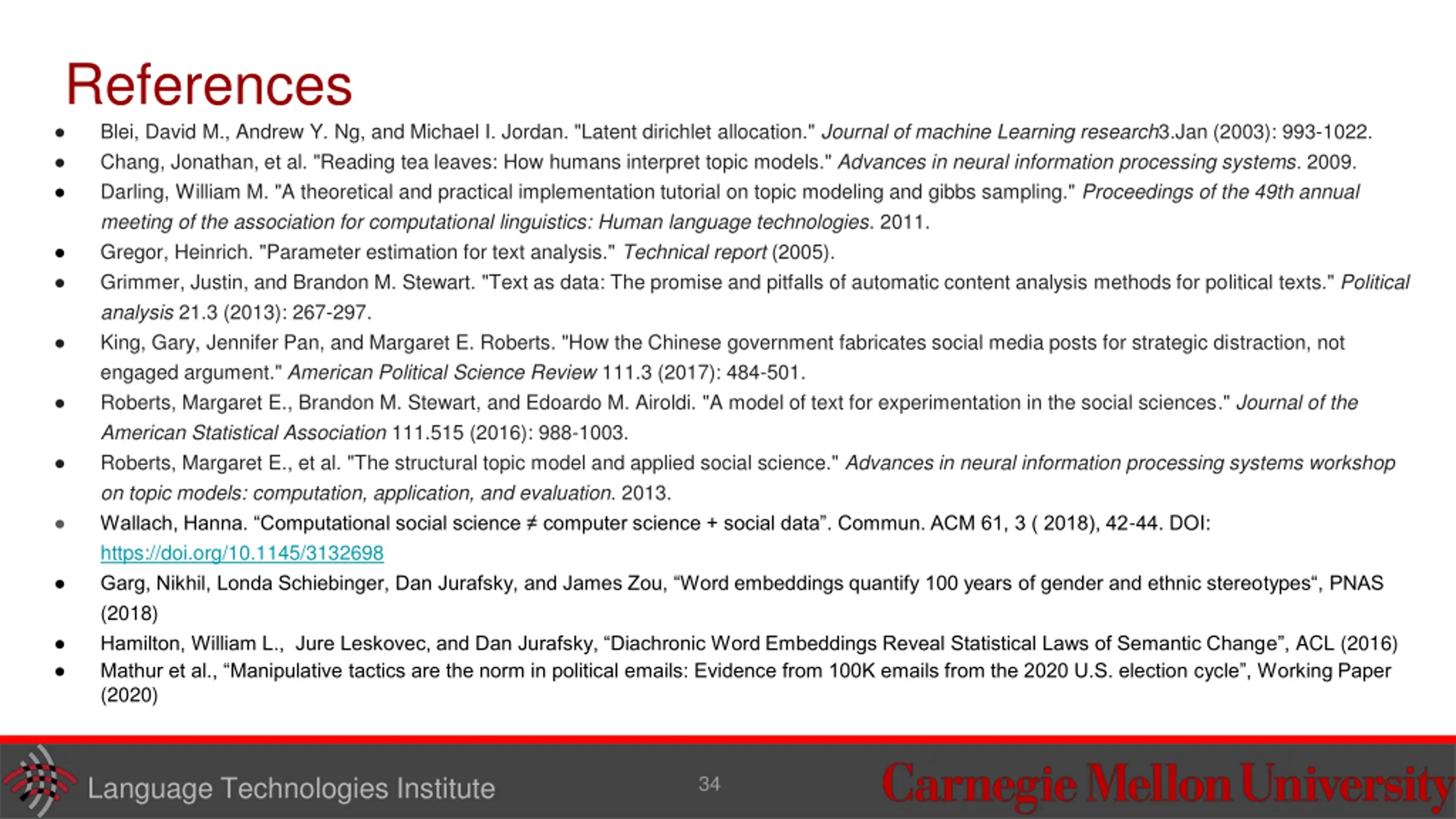 References Blei, David M., Andrew Y. Ng, and Michael I. Jordan. "Latent dirichlet allocation." Journal of machine Learning research3.Jan (2003): 993-1022. Chang, Jonathan, et al. "Reading tea leaves: How humans interpret topic models." Advances in neural information processing systems. 2009. Darling, William M. "A theoretical and practical implementation tutorial on topic modeling and gibbs sampling." Proceedings of the 49th annual meeting of the association for computational linguistics: Human language technologies. 2011. Gregor, Heinrich. "Parameter estimation for text analysis." Technical report (2005). Grimmer, Justin, and Brandon M. Stewart. "Text as data: The promise and pitfalls of automatic content analysis methods for political texts." Political analysis 21.3 (2013): 267-297. King, Gary, Jennifer Pan, and Margaret E. Roberts. "How the Chinese government fabricates social media posts for strategic distraction, not engaged argument." American Political Science Review 111.3 (2017): 484-501. Roberts, Margaret E., Brandon M. Stewart, and Edoardo M. Airoldi. "A model of text for experimentation in the social sciences." Journal of the American Statistical Association 111.515 (2016): 988-1003. Roberts, Margaret E., et al. "The structural topic model and applied social science." Advances in neural information processing systems workshop on topic models: computation, application, and evaluation. 2013. Wallach, Hanna. Computational social science computer science + social data . Commun. ACM 61, 3 ( 2018), 42-44. DOI: https://doi.org/10.1145/3132698 Garg, Nikhil, Londa Schiebinger, Dan Jurafsky, and James Zou, Word embeddings quantify 100 years of gender and ethnic stereotypes , PNAS (2018) Hamilton, William L., Jure Leskovec, and Dan Jurafsky, Diachronic Word Embeddings Reveal Statistical Laws of Semantic Change , ACL (2016) Mathur et al., Manipulative tactics are the norm in political emails: Evidence from 100K emails from the 2020 U.S. election cycle , Working Paper (2020) 34 Language Technologies Institute 34
