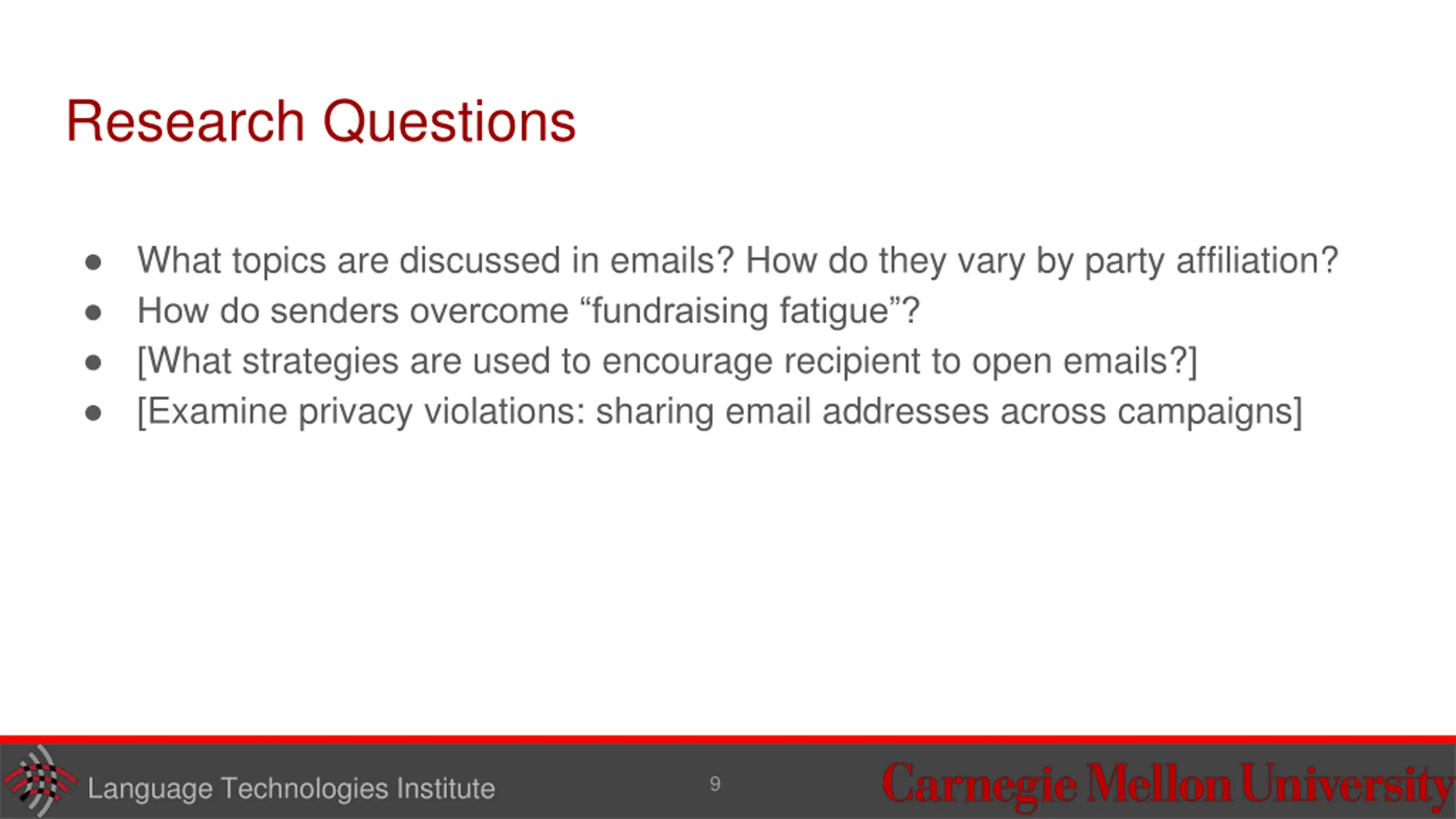 Research Questions What topics are discussed in emails? How do they vary by party affiliation? How do senders overcome fundraising fatigue ? [What strategies are used to encourage recipient to open emails?] [Examine privacy violations: sharing email addresses across campaigns] 9 Language Technologies Institute 9