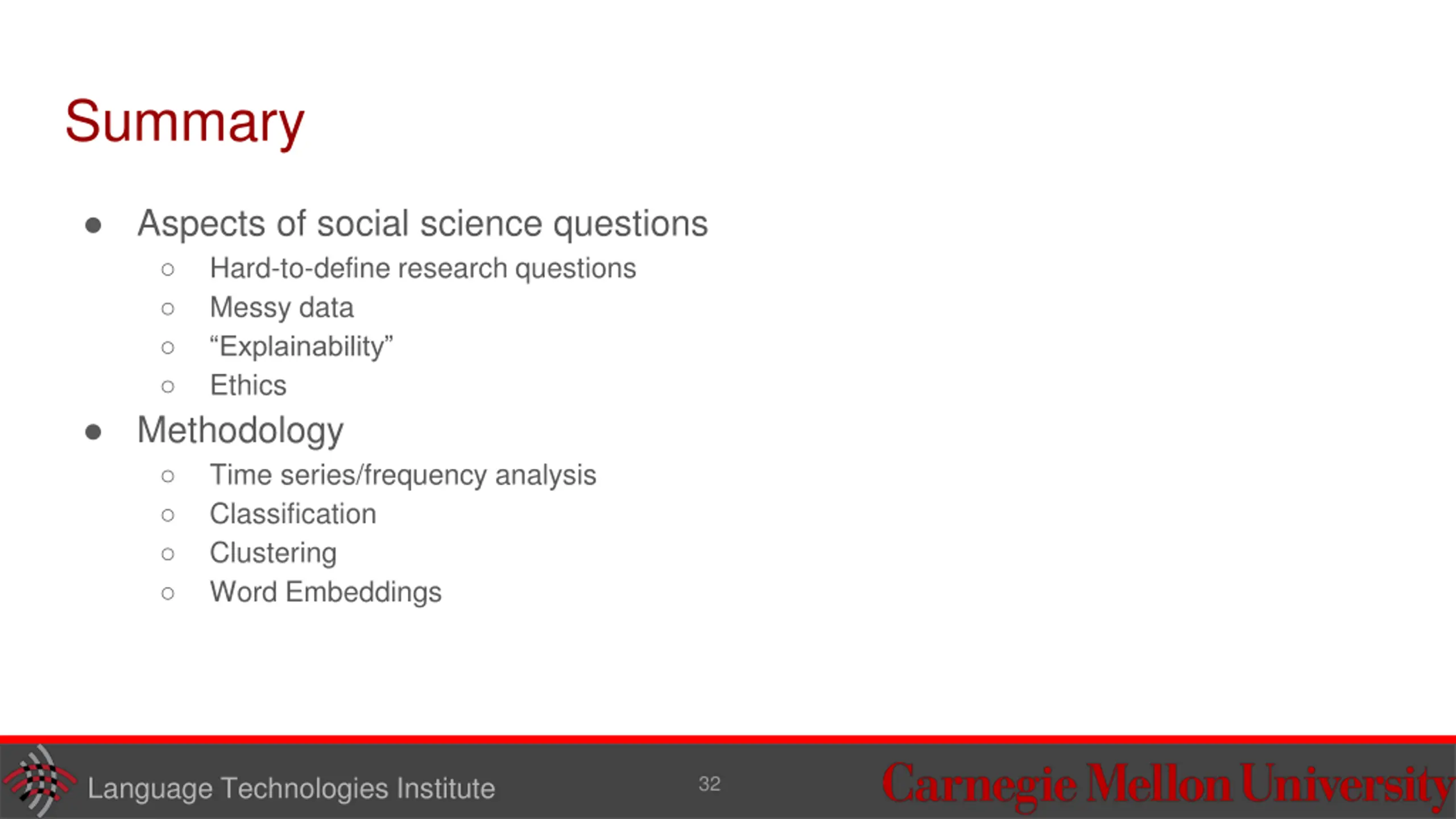 Summary Aspects of social science questions Hard-to-define research questions Messy data Explainability Ethics Methodology Time series/frequency analysis Classification Clustering Word Embeddings 32 Language Technologies Institute 32