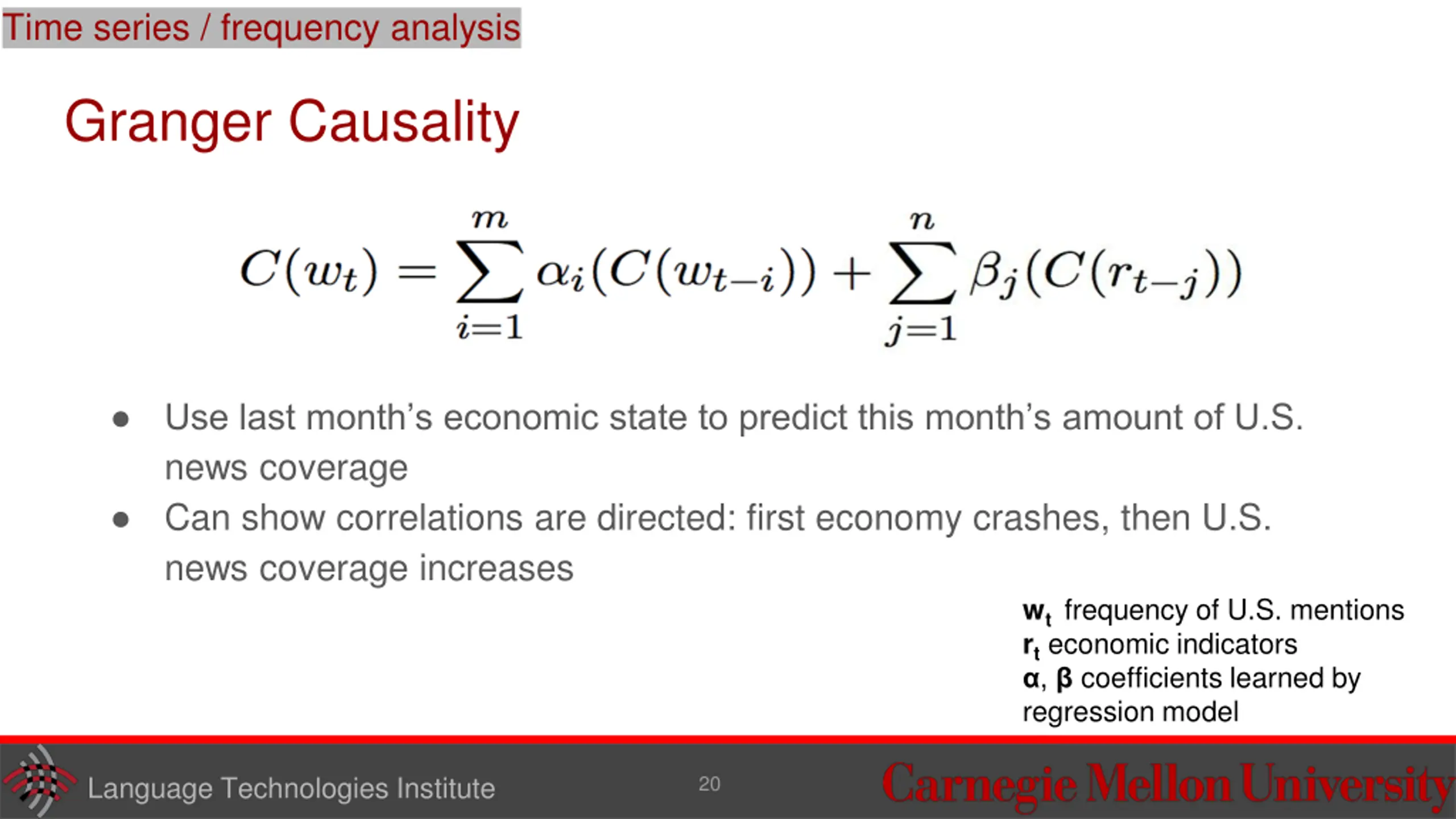 Time series / frequency analysis Granger Causality Use last month s economic state to predict this month s amount of U.S. news coverage Can show correlations are directed: first economy crashes, then U.S. news coverage increases wt frequency of U.S. mentions rteconomic indicators , coefficients learned by regression model 20 Language Technologies Institute 20