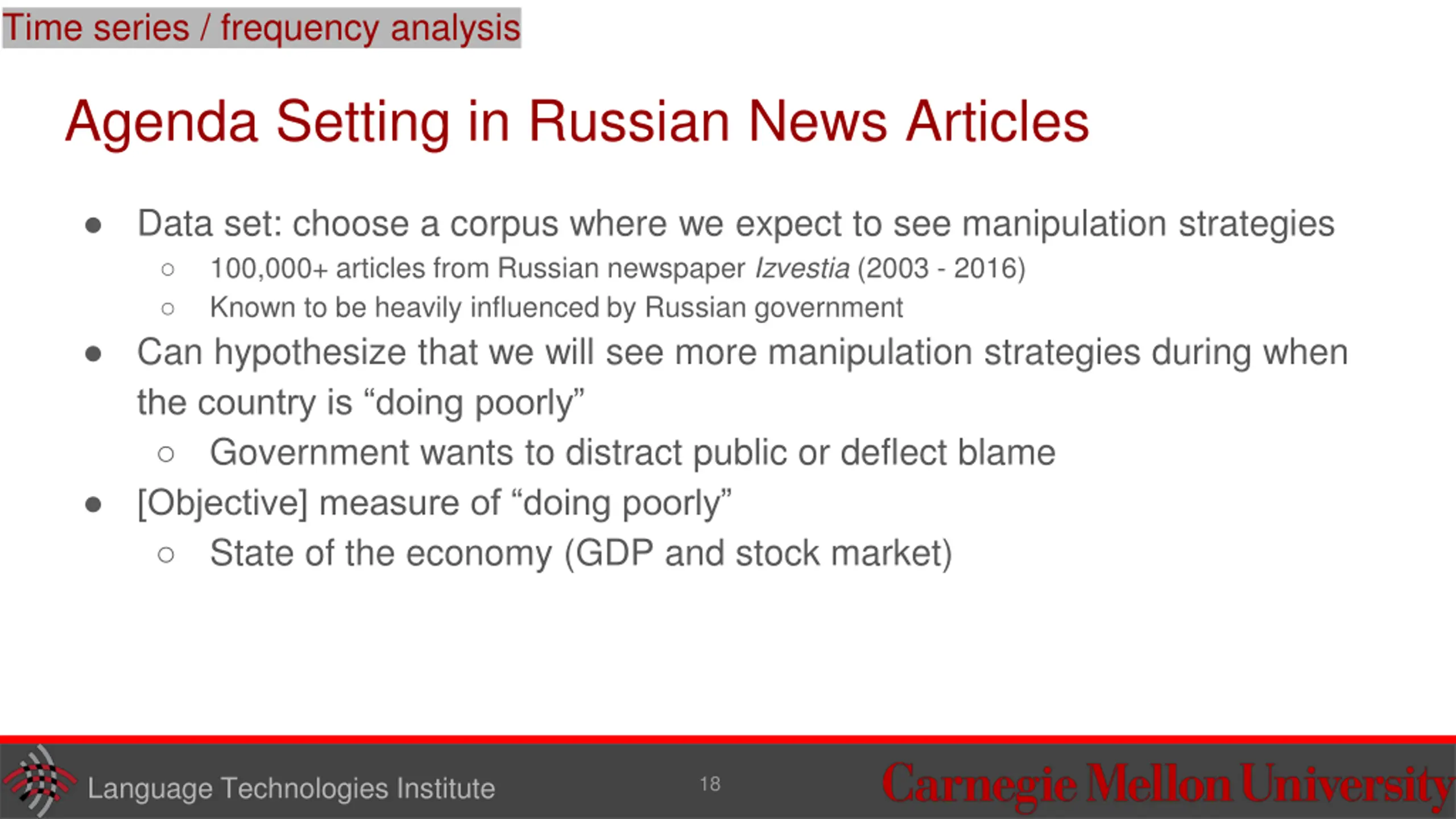 Time series / frequency analysis Agenda Setting in Russian News Articles Data set: choose a corpus where we expect to see manipulation strategies 100,000+ articles from Russian newspaper Izvestia (2003 - 2016) Known to be heavily influenced by Russian government Can hypothesize that we will see more manipulation strategies during when the country is doing poorly Government wants to distract public or deflect blame [Objective] measure of doing poorly State of the economy (GDP and stock market) 18 Language Technologies Institute 18