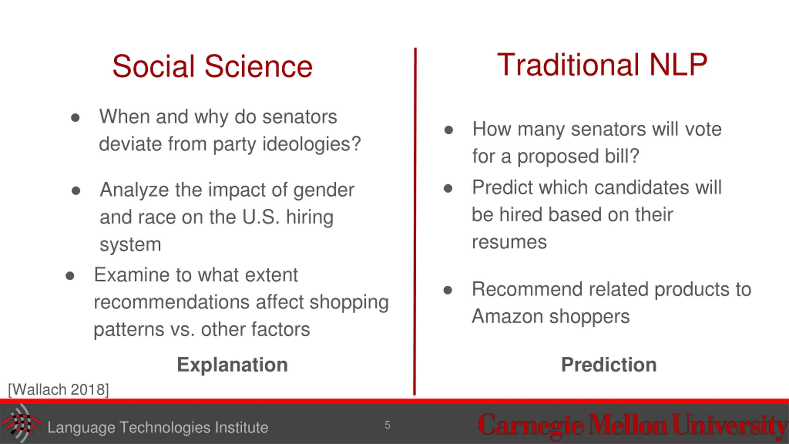 Traditional NLP Social Science When and why do senators deviate from party ideologies? How many senators will vote for a proposed bill? Predict which candidates will be hired based on their resumes Analyze the impact of gender and race on the U.S. hiring system Examine to what extent recommendations affect shopping patterns vs. other factors Recommend related products to Amazon shoppers Explanation Prediction [Wallach 2018] 5 Language Technologies Institute 5