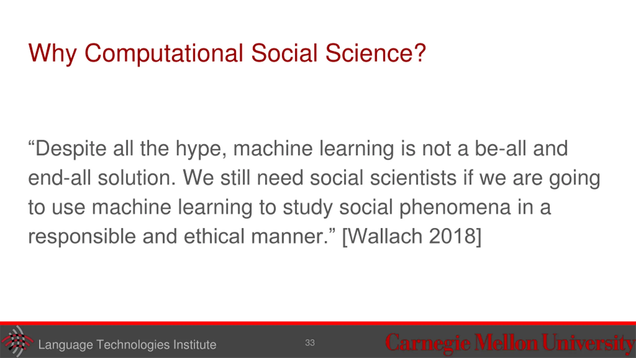 Why Computational Social Science? Despite all the hype, machine learning is not a be-all and end-all solution. We still need social scientists if we are going to use machine learning to study social phenomena in a responsible and ethical manner. [Wallach 2018] 33 Language Technologies Institute 33