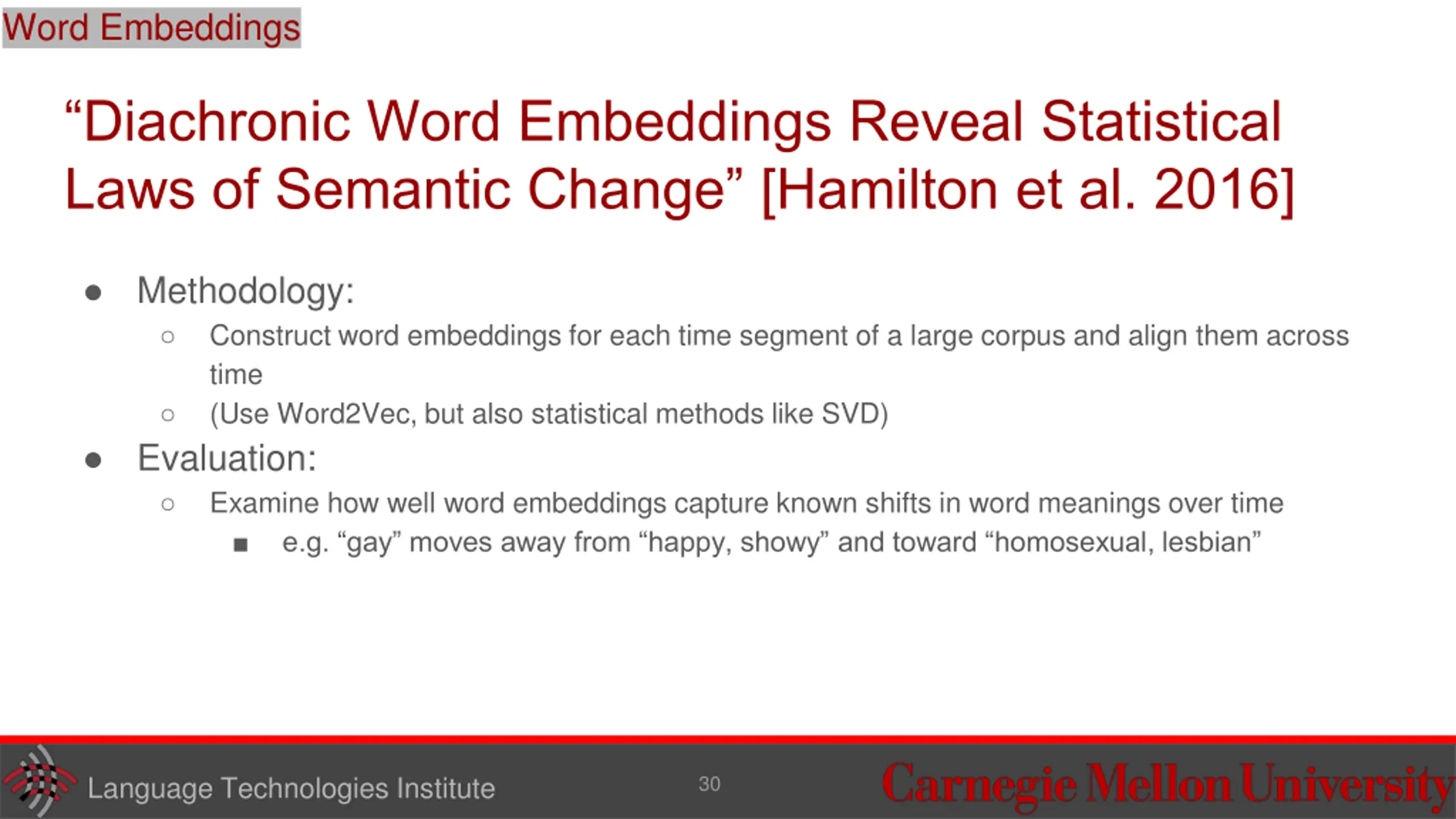 Word Embeddings Diachronic Word Embeddings Reveal Statistical Laws of Semantic Change [Hamilton et al. 2016] Methodology: Construct word embeddings for each time segment of a large corpus and align them across time (Use Word2Vec, but also statistical methods like SVD) Evaluation: Examine how well word embeddings capture known shifts in word meanings over time e.g. gay moves away from happy, showy and toward homosexual, lesbian 30 Language Technologies Institute 30